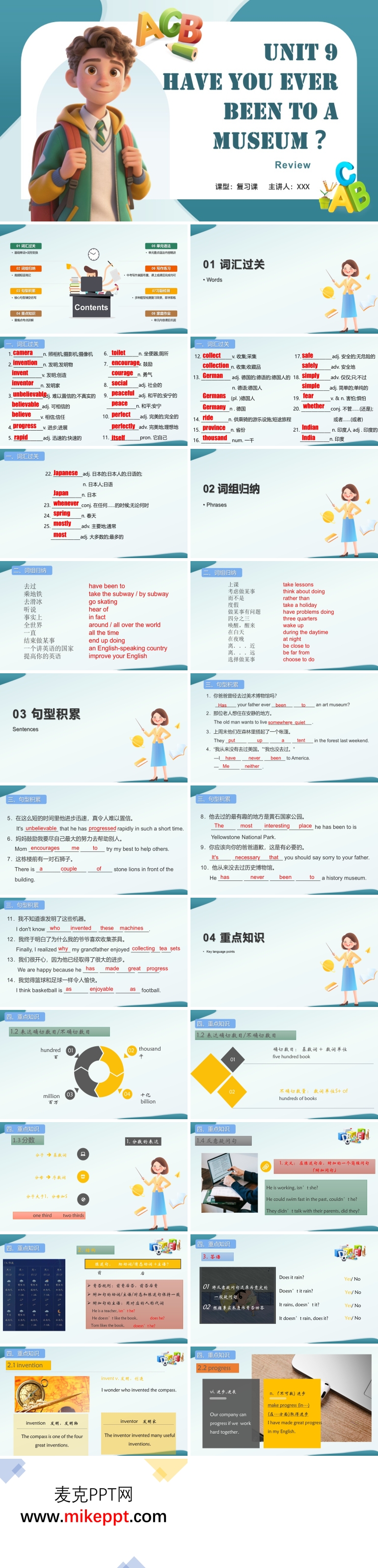 这套专为初中英语第九单元“Have You Ever Been to a Museum?”打造的复习课件,以“词汇—短语—句型—语法”四级递进的方式,将零散知识点系统整合,助力学生在有限时间内完成高效回顾。开篇用浅蓝底色与背负书包的卡通人物瞬间锁定“复习”主题,营造轻松专注的氛围。主体内容通过清晰目录(Contents)切分为四大模块:“词汇过关”集中呈现camera、invent等核心单词,配音标与词性,方便快速扫盲;“词组归纳”提炼常用搭配如take photos、be invented by等,附英汉互译,强化固定用法;“句型积累”以“Have you ever...?/I have never...”等高频交际句为核心,提供情景替换例句,帮助学生复现语境;“重点知识”则用表格与思维导图整合数词表达、反意疑问句构成及语调规则,实现语法点的可视化。各板块标题采用不同亮色块区分,层次分明,重点句型与易错处加粗或标红,一目了然。版面文字疏密有致,图文比例恰当,既保证信息密度,又兼顾视觉舒适。整套课件设计规范、逻辑清晰,方便教师按模块推进复习,也利于学生快速定位薄弱区域,进行针对性巩固,是一份兼顾知识系统性与课堂操作性的实用复习材料。