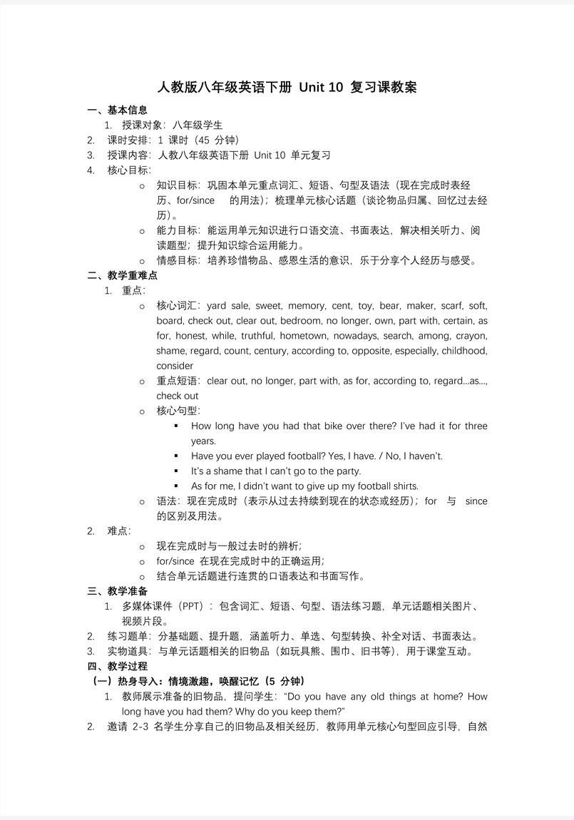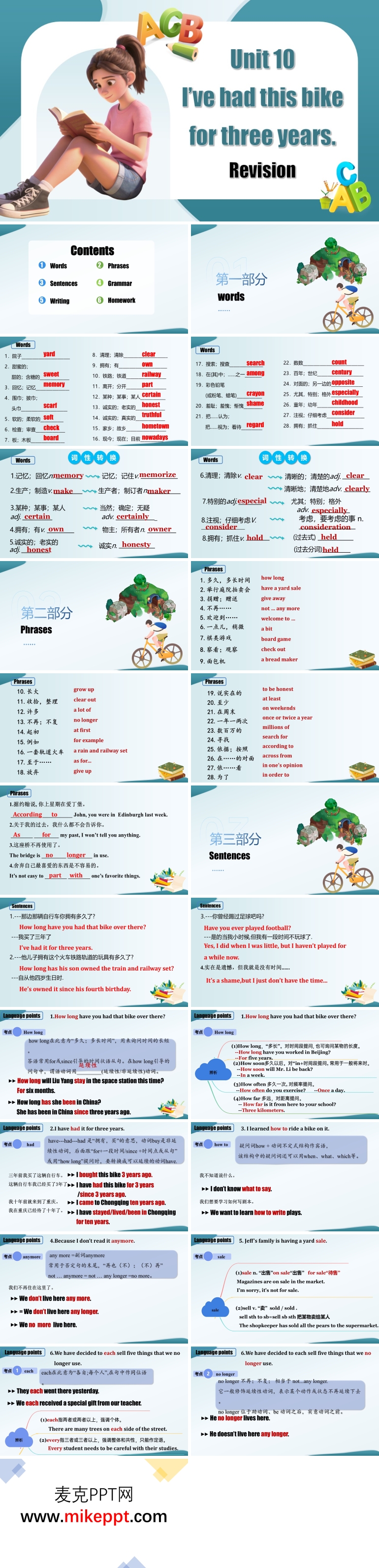 这份专为八年级下册 Unit 10 "I've had this bike for three years" 量身定制的复习课件,以“模块化梳理 + 可视化练习”为核心理念,帮助学生在有限时间内完成“词汇—短语—句型—语法—写作”的全链路巩固。开篇用浅色背景与手持书本的卡通女孩营造轻松氛围,瞬间锁定“复习”主题;清晰的“Contents”目录将整节课切分为 Words、Phrases、Sentences、Grammar、Writing 五大板块,并辅以 Homework 收尾,逻辑由点到面、层层递进,完全符合“先归纳、再查漏补缺、后拓展应用”的复习课节奏。 内容编排上,课件首先以图文并茂的方式集中呈现核心词汇:yard、sweet、memory、consider、honest、search、among、century、part with 等,配合中英文释义和填空练习,帮助学生快速唤醒词义与拼写;随后预计展开的 Phrases 板块将梳理“have a yard sale、search for、part with sth.”等高频搭配,Sentences 板块则聚焦“How long have you had it? — I've had it for/since...”等现在完成时经典句型,通过英汉互译和句型转换巩固结构。Grammar 部分以时间轴和对比表格可视化“for/since”用法差异,并穿插易错点警示;Writing 板块提供“描述物品陪伴时长”写作框架,从开头介绍、中段故事到结尾情感升华,给出连接词与评价性语言,降低写作焦虑。各板块标题采用不同明亮色块区分,重点内容加粗或标红,页面清爽、信息层次清晰,既方便教师按需跳转,也利于学生快速定位薄弱点。整体而言,这份设计规范、内容凝练、互动性强的复习材料,不仅能让教师高效引领课堂,更能让学生在短时间内完成知识的系统回顾与迁移应用,为后续单元检测和写作任务奠定坚实基础。