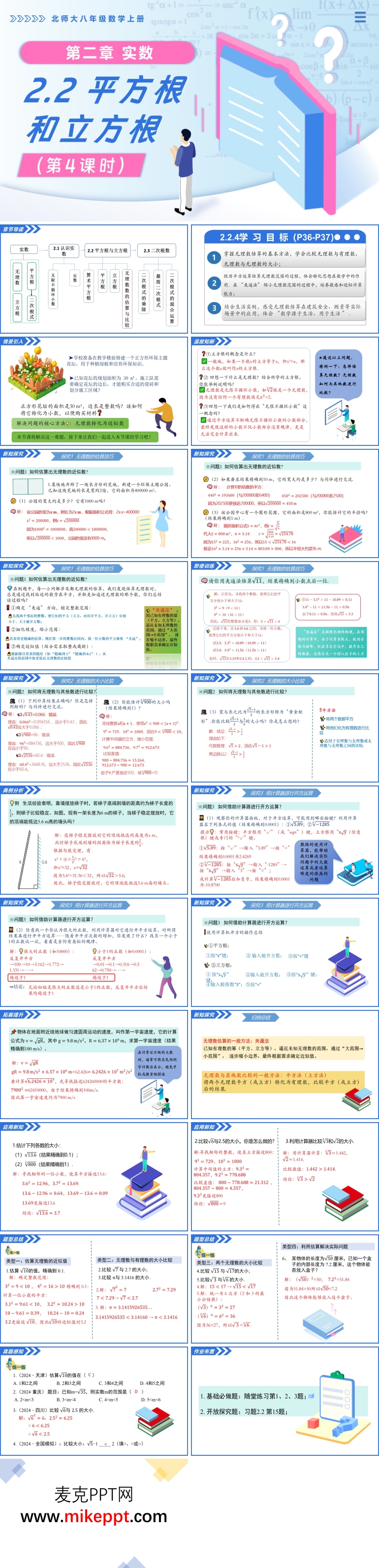 本套 PPT 课件是为北师大数学八年级上册 2.2 平方根和立方根(第 4 课时)精心设计的教学资源,共包含 24 张幻灯片。本节课的核心目标是帮助学生进一步巩固平方根和立方根的概念、性质及其求法,重点掌握平方根与立方根在复杂实际问题中的应用。同时,通过本节课的学习,激发学生对数学学习的兴趣,增强学生解决实际问题的信心,培养学生认真思考、严谨求学的学习态度。 课件的开篇通过回顾立方根、无理数以及无限不循环小数的相关知识,帮助学生梳理已学内容,为本节课的学习做好铺垫。这种复习导入的方式不仅巩固了学生的知识体系,还自然地引出了本节课的学习主题,使学生能够快速进入学习状态,明确本节课的学习目标。 在新知识的讲解部分,PPT 通过具体问题引导学生逐步掌握估算无理数的技巧和比较无理数大小的方法。这些内容是本节课的重点和难点,通过生动的实例和详细的讲解,学生能够更加直观地理解无理数的估算和大小比较方法。同时,PPT 还引导学生学会使用计算器进行开方运算,帮助学生掌握现代数学工具的使用方法,提高计算效率和准确性。 典例分析环节是本套 PPT 的核心部分。通过精心设计的例题,针对复杂实际问题进行具体分析,引导学生逐步思考并解决问题。这些例题不仅涵盖了平方根和立方根的常见应用,还涉及了一些复杂的实际问题,如工程计算、物理问题中的数学应用等。通过这些例题的讲解,学生能够学会如何将数学知识应用于复杂情境,提高解决实际问题的能力。 此外,PPT 还设置了巩固练习和真题感知两个环节。巩固练习环节通过多样化的题目设计,帮助学生进一步加强对知识点的理解和应用。这些练习题涵盖了从基础到拓展的不同层次,既满足了学生巩固知识的需求,又为学有余力的学生提供了挑战机会。真题感知环节则让学生提前接触中考真题,感受真实的考试情境,了解命题方向和难度,从而提前做好备考准备,增强应试能力。 整套 PPT 课件注重知识的系统性和实用性,通过合理的教学设计和丰富的教学资源,为学生提供了一个全面、高效的学习平台。它不仅帮助学生巩固了平方根和立方根的核心知识,还通过实际问题的应用展示了数学的实用性和价值,激发了学生的学习兴趣。这种教学设计不仅有助于学生在数学学习中取得更好的成绩,更培养了他们运用数学知识解决实际问题的能力,为学生的未来发展奠定了坚实的基础。
