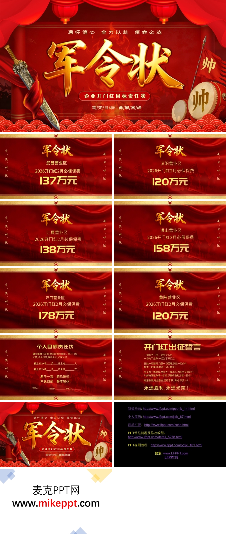 这套专为2026年度企业销售业务打造的军令状PPT,以十页精炼篇幅构建起目标承诺与战略落地的完整闭环。在现代企业管理语境下,军令状早已超越传统意义上的责任文书,它既是个人与企业双向奔赴的决心见证,更是承载组织文化、凝聚团队共识的精神载体。通过这一庄严仪式,企业得以将战略目标清晰传导至每个业务单元,而员工则在承诺中激活内在驱动力,形成"责任共担、荣誉共享"的战斗氛围。尤其在销售战线,军令状所特有的仪式感和目标可视化效应,能够显著强化员工的使命感与归属感,使其在签署瞬间便与组织价值观深度同频。 该演示文稿采用区域化模块设计,系统呈现五大核心板块。首章聚焦汉阳营业区,不仅列示历年保费规模、增长率等关键经营数据,更明确提出新财年保费冲刺目标,实现承前启后;第二章切入江夏营业区,遵循复盘与展望并重的逻辑;第三章详述洪山营业区的战果,在展示保费达成率、市场份额等亮眼指标的同时,剖析成功经验并立下来年更高标杆;第四章合并呈现汉口与黄坡两大营业区的军令状,体现资源协同与区域联动策略;终章则升华至个人层面,涵盖目标责任状的具体条款与"开门红"出征誓词,将集体意志分解为个体行动,确保战略掷地有声。 这套PPT的价值不仅在于目标宣示,更在于其构建了"数据呈现—成果复盘—问题反思—责任分解—文化浸润"的激励闭环。它让销售管理从冰冷的数字追踪,转向有温度的心理契约建设,最终推动业绩增长的飞轮持续转动。
