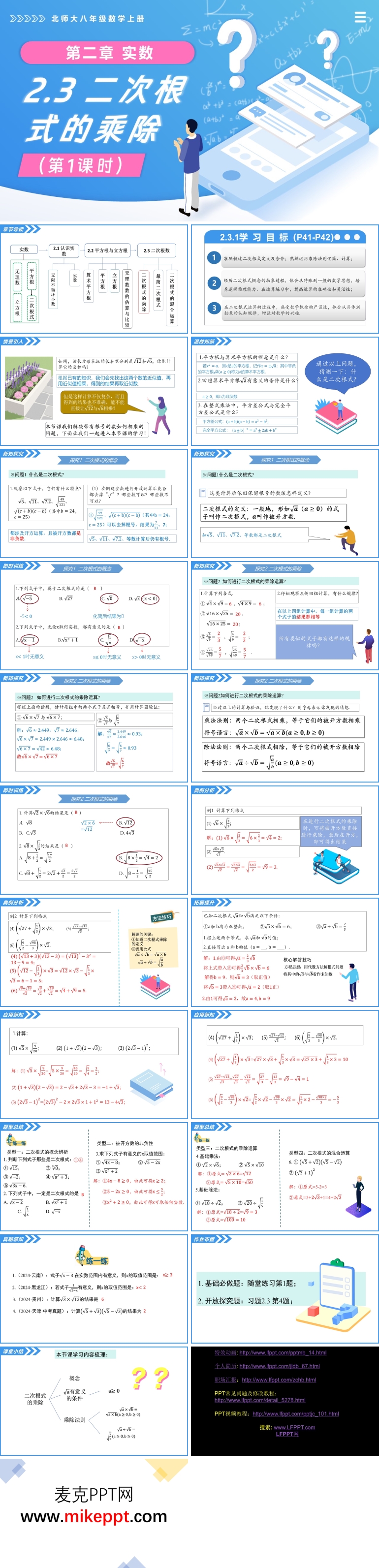 本套 PPT 课件是为北师大数学八年级上册 2.3 二次根式(第 1 课时)精心设计的教学资源,共包含 22 张幻灯片。本节课的核心目标是帮助学生深入理解二次根式的定义,明确二次根式有意义的条件,掌握二次根式的基本性质,并能够运用这些性质进行简单的二次根式化简。通过本节课的学习,学生将体会数学知识之间的内在联系,感受数学的严谨性和实用性,从而提高解决实际问题的能力。 课件的开篇通过回顾平方根与算术平方根的概念以及算术平方根有意义的条件,为学生搭建了知识的衔接点。这种复习导入的方式不仅巩固了学生对已有知识的理解,还自然引出了本节课的学习主题——二次根式。通过对比和联系,学生能够更好地理解二次根式与之前所学知识的关联,为新知识的学习奠定坚实基础。 在新知识的讲解部分,PPT 通过具体问题引导学生逐步探索二次根式的概念。通过生动的实例和详细的讲解,学生能够清晰地理解二次根式的定义以及其有意义的条件。接着,课件进一步引导学生掌握二次根式的乘除运算方法。这一部分通过逐步解析运算过程,帮助学生理解二次根式运算的规则和技巧,使学生能够熟练进行二次根式的乘除运算。 典例分析环节是本套 PPT 的重要组成部分。通过精心设计的例题,针对具体问题进行详细分析,引导学生逐步思考并解决问题。这些例题不仅涵盖了二次根式的基本性质和运算方法,还涉及了一些实际问题中的数学应用。通过这些例题的讲解,学生能够学会如何将二次根式的知识应用于实际问题,提高解决实际问题的能力。 此外,PPT 还设置了巩固练习和真题感知两个环节。巩固练习环节通过多样化的题目设计,帮助学生进一步加强对知识点的理解和应用。这些练习题涵盖了从基础到拓展的不同层次,既满足了学生巩固知识的需求,又为学有余力的学生提供了挑战机会。真题感知环节则让学生提前接触中考真题,感受真实的考试情境,了解命题方向和难度,从而提前做好备考准备,增强应试能力。 整套 PPT 课件注重知识的系统性和实用性,通过合理的教学设计和丰富的教学资源,为学生提供了一个全面、高效的学习平台。它不仅帮助学生扎实掌握二次根式的定义、性质和运算方法,还通过实际问题的应用展示了数学的实用性和价值,激发了学生的学习兴趣。这种教学设计不仅有助于学生在数学学习中取得更好的成绩,更培养了他们运用数学知识解决实际问题的能力,为学生的未来发展奠定了坚实的基础。