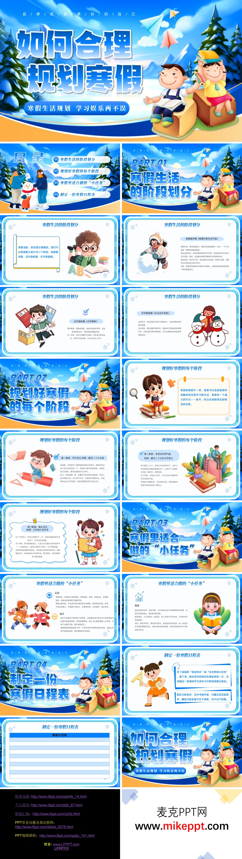 这套PPT以“如何合理规划寒假”为主题,从结构到视觉设计都紧密围绕学生假期的科学安排展开。封面采用蓝天、雪山、松林与滑雪孩童的插画,奠定了冬日假期轻松愉快的基调,同时点明主题。 内容分为四个清晰的部分:首先将寒假生活划分为不同阶段,帮助学生对假期形成整体认识;其次详细讲解如何规划每个阶段的时间与任务;第三部分列举寒假中可以完成的“小任务”,如阅读、运动、实践等,强调学习与娱乐的平衡;最后则引导学生动手制定一份具体的寒假日程表,将规划落到实处。 整体设计上,PPT构图简洁、色彩活泼,搭配了写作业、堆雪人等生活化场景插画,生动直观。文字内容虽在示例中部分重复,但逻辑主线明确——从宏观的阶段划分,到具体的任务建议,再到可操作的日程制定,逐步引导学生学会自主、合理地安排假期,实现放松与成长的双重目标。