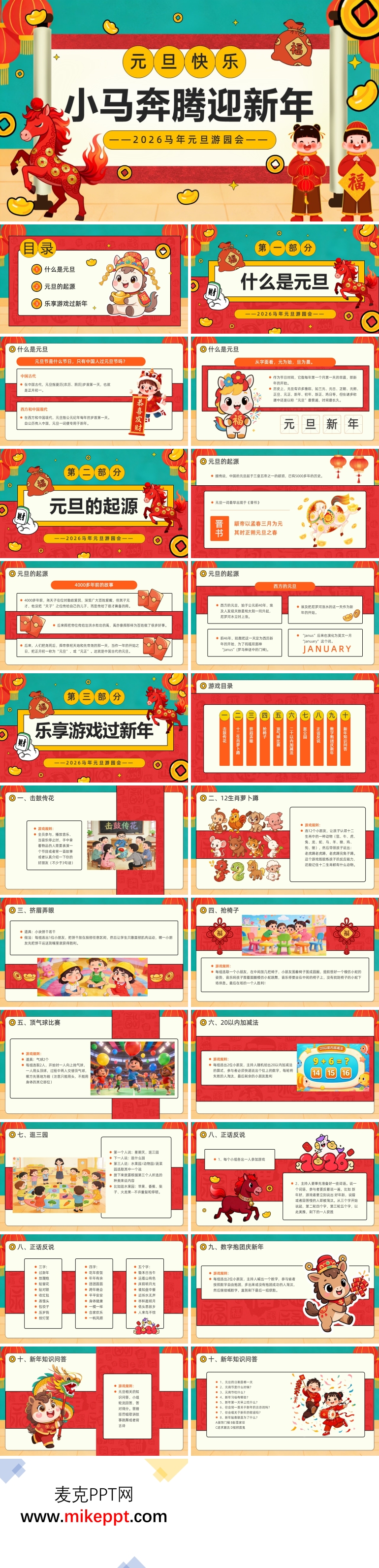 这是一套专为幼儿园及小学低年级设计的元旦主题游戏PPT,共24页,将节日文化与儿童心理发展巧妙融合,构建起集教育性、趣味性与互动性于一体的综合性活动方案。课件开篇便点明核心教育价值:通过精心设计的游戏环节,引导孩子们在协作完成任务的过程中深刻体会团队精神,学会尊重同伴、倾听意见、主动沟通,从而提升社交自信与情绪管理能力。教师的适时鼓励贯穿始终,营造安全开放的尝试氛围,让孩子在"玩中学"的愉悦体验中自然成长。 内容架构上,课件分为三大板块层层递进。第一部分"什么是元旦"立足国际视野,既阐释元旦作为"新年开端"的通用概念,又呈现各国异彩纷呈的庆祝习俗,更着重强调这一节日所承载的"辞旧迎新、憧憬未来"的文化意义,为孩子们打开认识世界文化的窗口。第二部分"元旦的起源"则带领孩子们展开时空探索,追溯西方公历新年的传统脉络,并重点讲述中国4000多年前"颛顼始制历法"的古老故事,在对比中感受文明多样性,厚植文化认同根基。 第三部分"乐享游戏过新年"是整套课件的高潮与精髓。游戏目录涵盖"击鼓传花"的紧张刺激、"十二生肖萝卜蹲"的趣味互动、"抢椅子"的敏捷竞技以及"逛公园"的情境模拟等经典项目,每个游戏均配有清晰的规则说明与安全提示。这种将认知学习与实践体验相结合的方式,不仅让孩子们在欢声笑语中感受节日氛围,更在潜移默化中实现能力提升,真正实现"寓教于乐"的教育理想,为元旦庆祝活动提供了兼具深度与温度的实施蓝本。