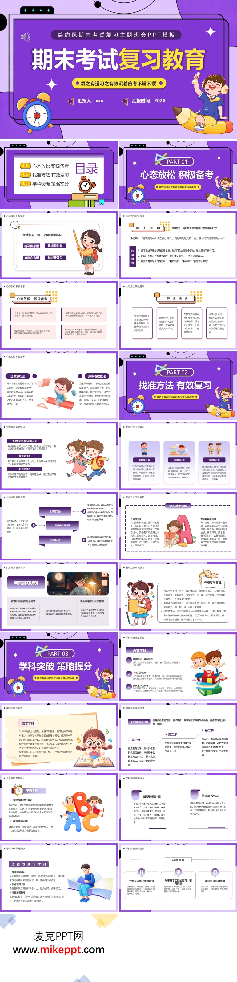 这套以“期末考试复习”为主题的PPT模板,旨在为学生提供一场全面、实用的复习指导班会。整体设计采用温馨的紫色系,搭配时钟、铅笔、书本等卡通元素,风格简洁而充满童趣,能有效缓解考试带来的紧张氛围。 内容结构清晰,分为三大核心板块。首先强调“心态放松,积极备考”,通过分析不同的考前心理状态,引导学生认识压力,并给出劳逸结合、积极暗示等方法,帮助学生建立自信、稳定的应考心态。其次聚焦“找准方法,有效复习”,从宏观上讲解如何制定复习计划、高效管理时间,旨在提升整体学习效率。最后深入“学科突破,策略提分”,针对不同学科的特点,提供具体的复习策略与答题技巧,力求实现精准提分。 整个PPT图文并茂,用生动的学生卡通形象辅助讲解,将科学的备考方法与积极的心理建设相结合,其核心目标是让学生能够“复之有道,习之有效”,最终实现“沉着应考,不骄不馁”。