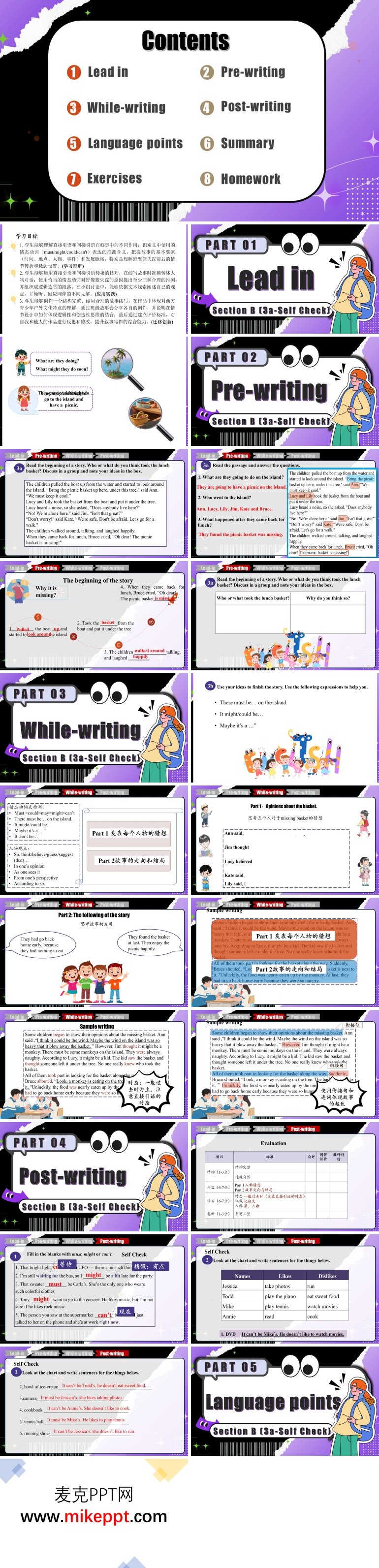 这份PPT专为初中英语Unit 8 Section B 3a-Self Check设计,以“推测物品归属”的情态动词must/might/can’t为语言核心,借助“故事续写”任务把语法教学与写作训练融为一体。课件流程分为Lead in、Pre-writing、While-writing、Post-writing等八个环节,层层递进,首尾呼应。Lead-in先用一幅“孩子们在公园野餐”的插图配合“他们可能在做什么?”的提问,引导学生用might be doing自由猜测,瞬间激活情态动词并营造悬念。Pre-writing阶段呈现故事开头:午餐篮突然失踪,留下空草地与一串脚印。学生分组讨论“谁拿走了篮子?”并在表格中记录推测理由,教师板书关键词,为后续写作积累素材与逻辑。While-writing环节明确任务:先用must/might/can’t发表人物猜想,再用连贯叙事续写故事走向;屏幕同步提供句式银行(“It must be... because...”, “The basket might have been taken by...”)和范文片段,学生按需取用,降低写作焦虑。Post-writing部分给出自评表,从情节连贯、情态动词使用、推测理由合理性三维打分,随后完成Self Check:情态动词填空+根据喜好推测物品归属,实现语法精准检测。整份课件以蓝绿为主、橙黄点缀,清新活泼;插图、表格、句式银行多模态呈现,既分散语言难点,又延长注意力。故事悬念驱动写作,写作反哺语法巩固,真正落实“用中学、学中用”,让学生在构思、推理、落笔的全过程中体验语言逻辑与创作乐趣,为后续更复杂的叙事写作奠定坚实基础。