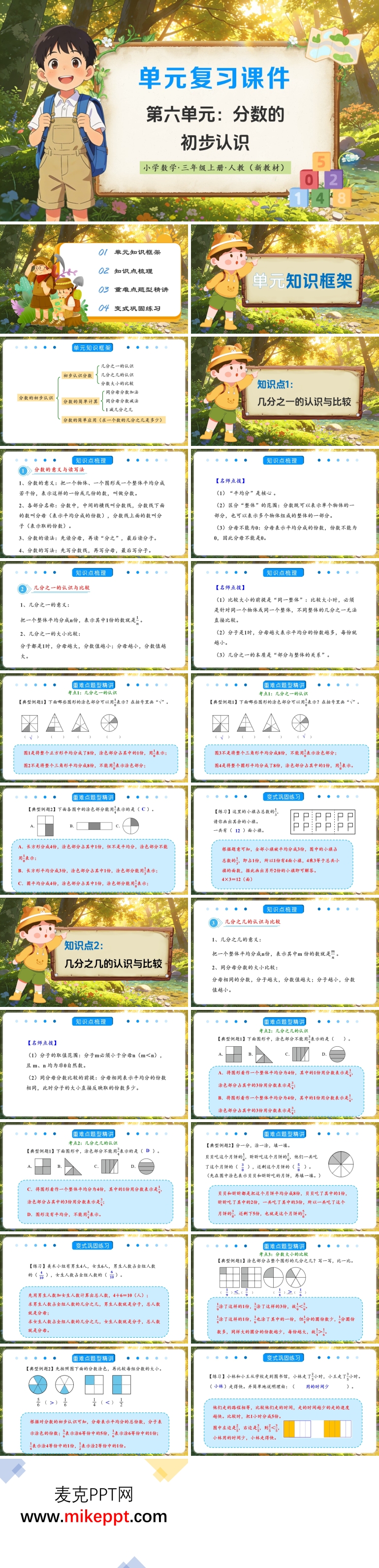 这份三年级上册“分数的初步认识”单元复习课件以“四大模块—三级递进—双线训练”为骨架,将零散知识织成网络,助力学生在40分钟内完成“概念再认—易错突破—情境活用”的螺旋提升。开篇“单元知识框架”用思维导图一次性呈现四大核心:①几分之一的认识与比较;②几分之几的认识与比较;③分数的简单计算;④分数的简单应用,让学生对复习范围一目了然。 “知识点梳理”环节先用动画切蛋糕:整体被平均分成若干份后,闪动1份揭示“几分之一”,再闪动多份揭示“几分之几”,动态对比让学生瞬间理解“份数”与“分数”的对应关系;紧接着用“同分子看分母、同分母看分子”的口诀配手势,帮助学生快速掌握分数大小比较的要领。 “重难点精讲”以典型例题切入:第一题给出多个图形,让学生用“平均分”标准快速排除干扰项,强化“平均分是分数生命线”的意识;第二题呈现“分小旗”“分月份”等生活情境,引导学生把“分母=总份数、分子=所取份数”模型迁移到真实任务,实现概念与应用的双向奔赴。 “变式巩固练习”采用游戏化闯关:基础层“选一选”判断图形与分数是否匹配;提高层“填一填”在数轴上标出简单分数位置;拓展层“用一用”解决“谁喝的水多”“谁剩下的蛋糕多”等比较问题,系统实时统计正确率,教师依据数据现场讲评,确保错误不过夜。 整体课件以“概念动画—口诀记忆—生活例题—游戏闯关”四连击,既帮助学生系统梳理分数的基础认知,又通过层层变式练习突破“是否平均分”“分子分母谁大谁小”等易错点,为后续学习分数加减法和分数乘除法奠定坚实的概念与心理双重基础。