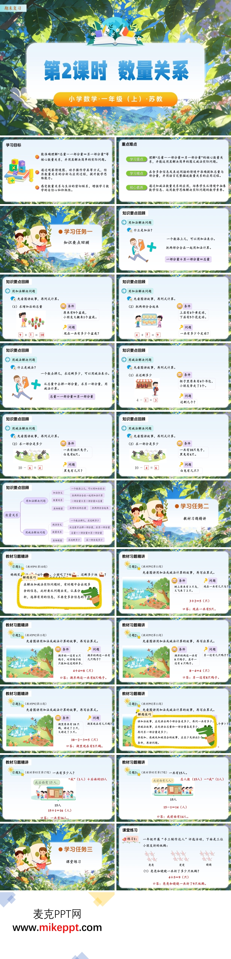 这份苏教版一年级上册期末复习课件聚焦“数量关系”第2课时,以“加法、减法生活模型”为主线,通过“知识要点—习题精讲—当堂练习”三环递进,帮助孩子把“会算”升级为“会用”。开篇用卡通动画演示核心关系:加法“一部分+另一部分=总量”,减法“总量-一部分=另一部分”,并配“合并糖果”“吃掉剩余”两个生活小故事,让学生边讲故事边列式,初步建立数量关系图式。 “教材习题精讲”精选三类真实情境:①糖果信息多余题,先圈有用数据再列式,渗透“从问题出发”的筛选策略;②池塘鸭子、天鹅情境,鼓励学生创编加、减法故事,培养逆向表达;③“我后面有15人”排队题,用动态小人演示“前、后、总数”的转换,突破“求部分量”思维难点。每题均留“说一说”空白,让学生用“因为……所以……”完整表达数量关系,做到“列式前先画图,计算后再说理”。 “课堂练习”以手工折纸鹤任务串联:每组折的只数即时填入统计表,集体提出“一共折了多少只”“送给幼儿园后还剩几只”等加、减问题,边操作边列式,既巩固加法模型,又体验数学与劳动、生活的紧密联系。整份课件用“关系口诀+情境动画+创编故事+动手操作”四连击,让加法、减法的数量关系从抽象符号转化为看得见、说得出、用得上的生活工具,为一年级期末应用题复习提供了扎实、生动、高效的第二课时方案。