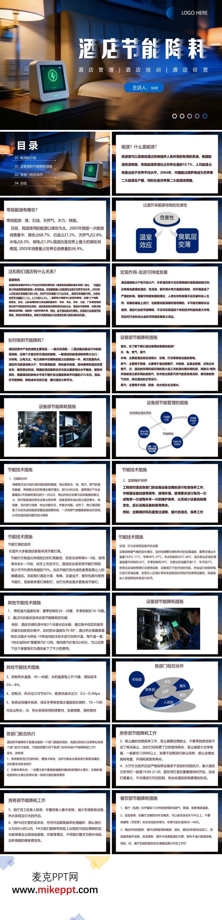 这张PPT以“酒店节能降耗”为主题,系统阐述了酒店行业实施节能管理的重要性和具体路径。内容结构清晰,首先从宏观层面介绍能源的基本概念及我国能源资源有限、消耗量大的现状,并指出过度开采能源可能引发的环境危害,以此引出酒店节能的紧迫性与积极意义。 随后,PPT聚焦于酒店内部的具体实践。在设备节能方面,提出从管理措施(如合理设置设备运行参数)和技术措施(如选用高效节能灯具)双管齐下,实现能耗降低。更突出的是,强调节能并非单一部门职责,需要房务部、餐饮部等运营单元与设备部门紧密协作,共同落实日常节能举措。 整体来看,这套PPT内容从认知到行动、从全局到局部,逻辑连贯,旨在提升酒店全员的节能意识,并通过管理与技术结合、部门联动的方式,推动酒店实现可持续经营与降本增效。