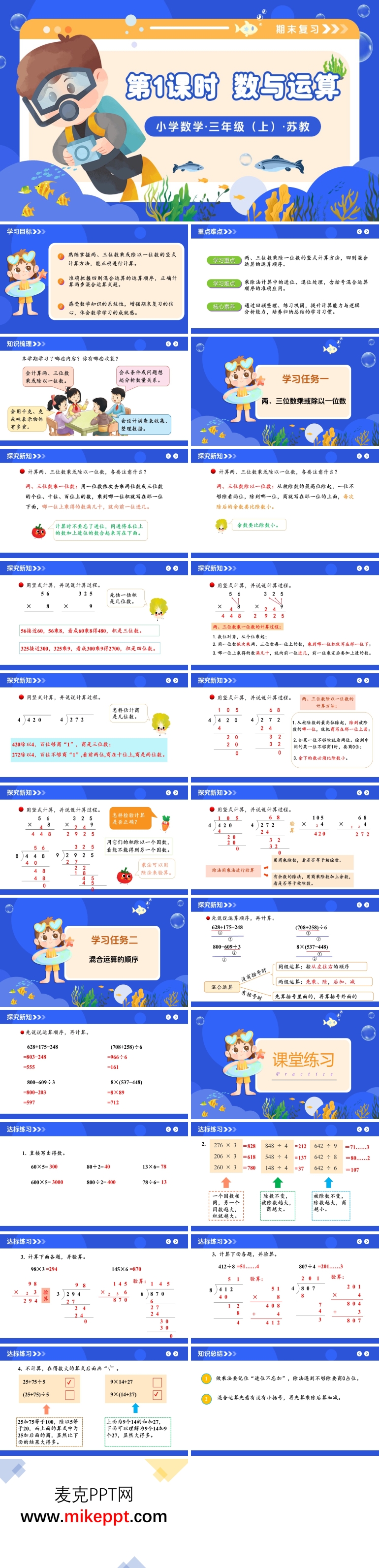 这份苏教版三年级上册期末复习课件聚焦“数与运算”板块,以“乘除算理—混合顺序—分层练习”为主线,系统梳理两、三位数乘除以一位数及混合运算的核心要点。开篇先用“学习目标雷达图”明确三大方向:竖式计算零失误、运算顺序不踩坑、估算验算快又准,让学生带着任务进复习。 知识梳理分两大任务推进。任务一“乘除竖式”用动态步骤拆分:乘法从个位乘起、满十向前一位进位,屏幕同步用红、蓝两色标注“乘积”与“进位小数字”,让学生一眼看清“谁乘谁、谁加谁”;除法从高位除起,余数必须比除数小,动画演示“高位不够看两位”的调商过程,再配估算口决“先估后算,误差减半”,强化验算意识。任务二“混合运算”用三色流程图呈现:同级运算从左到右,两级运算先乘除后加减,有括号先算括号内,再配“脱式计算”示范,要求学生写出每一步结果,杜绝“跳等”失分。 课堂练习采用“闯关升级”:基础口算抢答、竖式计算当堂板演、混合运算脱式订正、估算验算互批,系统实时统计正确率,教师依据数据当场“开门诊”。达标练习精选历年易错题:如“商的末尾0忘写”“括号位置看错”等,先放错例让学生找茬,再呈现正解并配“避坑口诀”,实现错误归零。 总结环节用“三句话”快闪:竖式要对位,进位写小字;除法从高到低,余数要比小;混合运算先分级,括号里面优先算。整份课件用“目标导航—步骤拆分—错例找茬—闯关达标”四连击,让乘除与混合运算的算理、算法、验算一气呵成,既提升计算速度,又培养严谨习惯,为期末高质量答题奠定坚实技能基础。