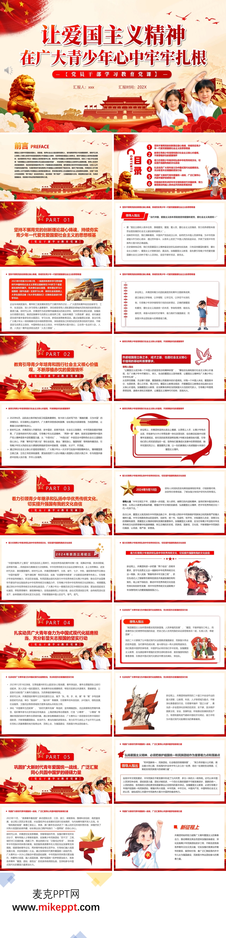 PPT模板内容主要通过PowerPoint软件分几个部分来向我们展开介绍有关于爱国主义精神培养学习课件的相关内容。PPT模板内容第一部分主要是有关于爱党爱国社会主义的思想根基的内容。第二部分主要是有关于青少年培育和践行社会主义核心价值观的相关内容。第三部分主要是有关于弘扬中华传统文化的相关内容。第四部分主要是有关于扎实动员广大青年奋力报效祖国的相关内容。第五部分主要是有关于扩大新时代青年爱国统一战线的相关内容。最后一部分主要是有关于共同推动构建人类命运共同体的相关内容。