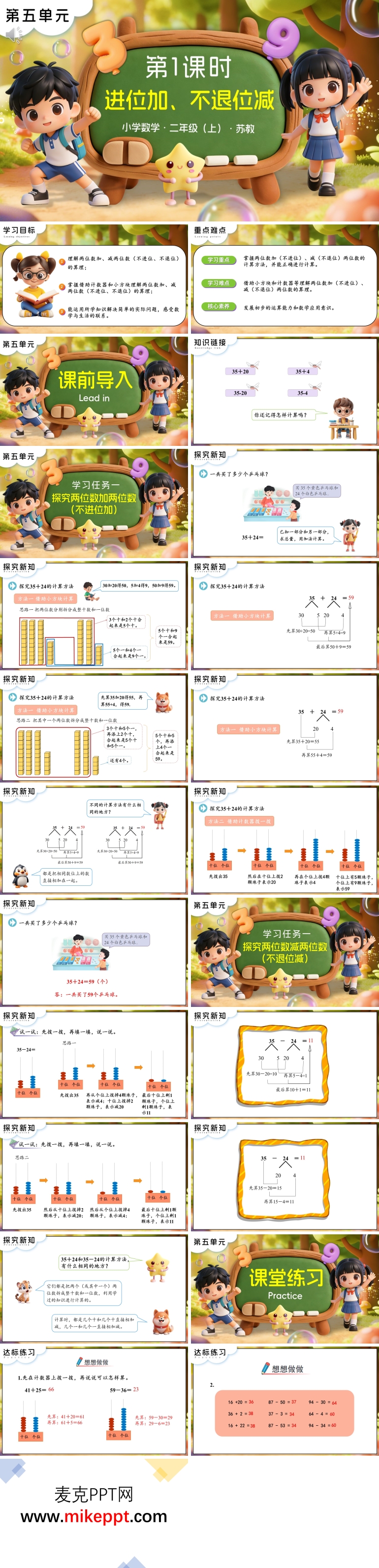 这是一份苏教版小学数学二年级上册第五单元第1课时的PPT课件,主题为“进位加、不退位减”,主要围绕两位数加两位数(不进位加)和两位数减两位数(不退位减)展开教学。该课件以“学习目标 - 探究新知 - 练习巩固”为教学脉络,旨在帮助学生系统掌握本节课的核心内容。 在教学设计上,课件首先明确了学习目标,即让学生理解不进位加法和不退位减法的算理,掌握正确的计算方法,并能够运用所学知识解决实际问题。同时,课件明确了重难点,即算理的理解和计算技能的掌握。通过课前导入环节,以情境题引出课题,激发学生的学习兴趣,引导他们进入学习状态。 在“探究新知”部分,课件借助小方块、计数器等直观教具,帮助学生逐步理解算理。首先,以“35+24”为例,拆解不进位加法的算理。通过将数分解为整十和个位分别相加,直观展示加法的计算过程。同时,同步讲解竖式计算的规则,强调“数位对齐、从个位加起”的重要性。这种直观与抽象相结合的方式,帮助学生更好地理解不进位加法的计算原理。 接着,以“35-24”为例,讲解不退位减法。通过演示数的拆分和竖式计算步骤,强化“数位对齐”这一核心要求。通过计数器等教具的演示,学生可以清晰地看到减法的计算过程,进一步加深对不退位减法算理的理解。 在“练习巩固”环节,课件设计了丰富多样的练习形式,包括计数器操作、口算、表格计算以及实际应用题(如图书数量统计)。这些练习不仅涵盖了基础计算,还结合实际问题,帮助学生将所学知识应用于生活场景中,提升他们的数学思维和解决问题的能力。通过多样化的练习,学生能够在实践中巩固所学知识,增强计算技能。 在视觉设计上,PPT采用了卡通元素与具象教具(如小方块、计数器)相结合的方式,贴合二年级学生的认知特点。这种设计不仅使课堂更加生动有趣,还通过直观的教具简化了抽象算理的理解,帮助学生更好地掌握计算方法。通过这样的教学设计,学生能够在轻松愉快的氛围中掌握不进位加法和不退位减法的核心知识,提升数学计算能力和应用能力,为后续学习奠定坚实的基础。