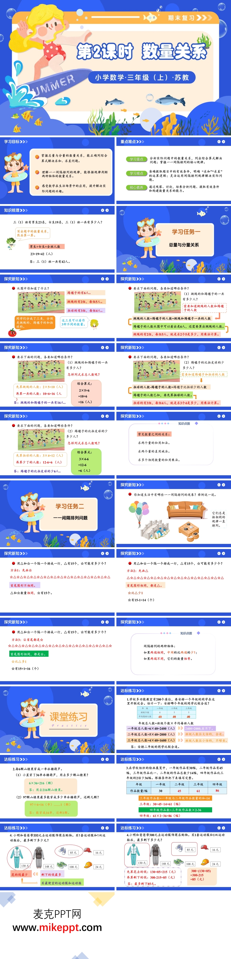 这份苏教版三年级上册“数量关系”期末复习课件以“总量与分量”“一一间隔排列”双主线并行,借助“情境示例—规律提炼—变式训练”三环相扣,帮助学生把应用题读图、列式、检验的完整套路一次吃透。开篇用“班级总人数”切入,先呈现男生24人、女生18人,引导学生用“部分+部分=总量”得出42人,再追问“如果已知总数和男生,怎样求女生?”反向体验“总量-部分=另一部分”,配合箭头图式,让加减互逆关系一目了然。 随后抛出“跳绳、踢毽子、拍球人数”生活情境:踢毽子3组每组6人,拍球15人,求“踢毽子比拍球多几人?”教师示范提取信息→画线段图→列乘减综合算式3×6-15=3,顺势总结“求和用加、求差用减、求几个几用乘”的口诀卡,学生贴桌角随时可查。 第二部分聚焦“一一间隔排列”。屏幕动态生成△☆△☆...两种开头:若以△开头且结尾也是△,则△比☆多1;若以☆开头且结尾也是☆,则☆比△多1;若首尾不同则数量相等。用颜色闪烁对应元素,学生直观看到“首尾相同差1,首尾相同则相等”的规律,再配“手指间隔”小游戏,让规律从屏幕走进掌心。 课堂练习采用“生活三件套”:①座位安排——每行6人,男生女生间隔坐,求最多能坐几人;②糖葫芦串——山楂和橘子间隔串,已知总量求差;③作品统计——画与字间隔贴,求两种作品数量。每题先让学生画间隔示意图,再口述规律,最后列式,系统实时统计正确率,教师依据错因再讲间隔图。 总结用“一句话”口诀:部分相加得总量,总量减部分得另一部分;间隔排列看首尾,相同差一不同则相等。整份课件用“情境图—线段图—间隔图—应用题”四连击,让数量关系从生活场景上升为数学模型,既训练综合列式,又培养画图建模能力,为期末解决复杂应用题奠定坚实的方法与思维双重基础。