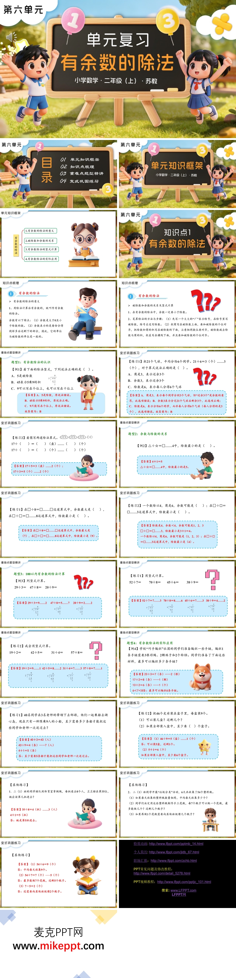这是一份针对苏教版小学数学二年级上册第六单元“有余数的除法”的单元复习PPT,旨在帮助学生系统回顾本单元的核心知识,巩固计算技能,并提升解决实际问题的能力。该PPT以“单元知识导学 - 知识梳理 - 变式巩固练习”为框架,通过清晰的结构设计,引导学生逐步梳理和巩固所学内容。 在复习的起始阶段,PPT通过“单元知识框架”部分,帮助学生理清本单元的核心脉络。这一环节为学生提供了一个宏观的视角,使他们能够清晰地看到各个知识点之间的联系,为进一步的复习奠定基础。 在知识梳理部分,PPT聚焦于有余数除法的核心要点。首先,帮助学生复习有余数除法的基本概念,明确被除数、除数、商和余数的名称及其在除法算式中的位置。接着,重点强调“余数必须小于除数”的规则,这是有余数除法的核心原则之一。通过反复强调这一规则,帮助学生在计算过程中避免常见错误。此外,PPT还详细回顾了有余数除法的计算方法,包括竖式计算的步骤,确保学生能够熟练掌握并准确运用。 在实际应用场景方面,PPT通过丰富的例子,如分物品、分组、装盒等,帮助学生理解有余数除法在日常生活中的广泛应用。这些实际场景不仅使抽象的数学知识变得生动具体,还帮助学生建立起数学与生活的联系,增强他们运用数学解决实际问题的意识。 练习设计是本PPT的重要组成部分,兼顾基础与变式两种类型。基础练习包括概念判断、填空和竖式计算等题型,旨在强化学生对有余数除法规则和算法的理解。通过这些基础练习,学生能够巩固核心概念,熟练掌握计算方法。变式练习则结合了生活中的具体场景,如分铅笔、装皮球等,设计了更具挑战性的应用题。这些变式练习不仅能够锻炼学生的思维能力,还能帮助他们将所学知识灵活运用于实际问题中,提升解决复杂问题的能力。 在视觉设计上,PPT融入了卡通元素,使整个课件更加生动有趣,符合二年级学生的认知特点和学习兴趣。清晰的板块划分和直观的内容展示,帮助学生更好地理解和记忆知识点。通过这样的设计,PPT不仅能够吸引学生的注意力,还能提高他们的学习积极性。 总之,这份PPT是一个实用的复习辅助工具,能够帮助学生在复习阶段系统地回顾“有余数的除法”这一单元的核心知识。通过知识梳理、基础练习和变式练习的有机结合,学生能够巩固有余数除法的核心概念与计算技能,同时提升将知识应用于实际问题的能力。