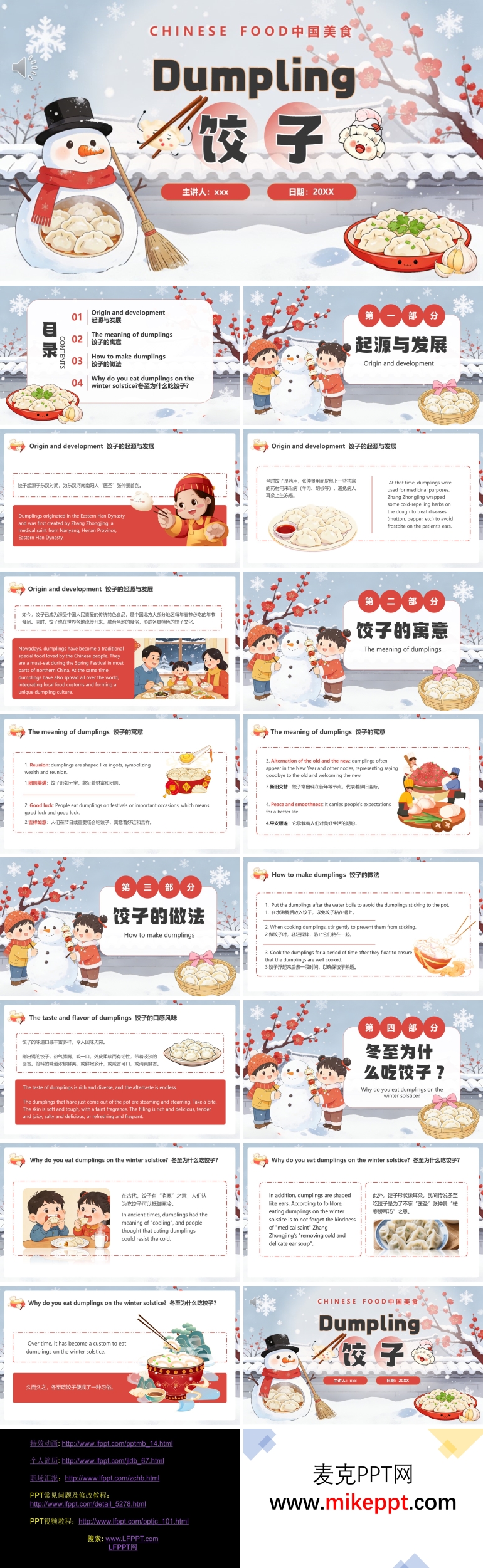 这套PPT以“中国美食——饺子”为主题,系统介绍了这一传统食物的文化历史与相关知识。整体设计采用浅蓝背景,点缀有雪人、梅花、红灯笼等卡通元素,画面清新活泼,充满冬日与节日的温馨氛围。 内容结构明确,通过左侧目录清晰分为四个主要部分。首先,在“起源与发展”中,探讨饺子从古代药用食物逐渐演变为节庆美食的历史过程。其次,“饺子的寓意”部分阐释了其作为团圆、财富象征的丰富文化内涵。再次,“如何包饺子”以图文并茂的方式,分步骤展示了从和面、拌馅到烹煮的实践方法。最后,“冬至为什么吃饺子”则结合节气习俗,解释了“冬至不端饺子碗,冻掉耳朵没人管”的民间说法。 整体而言,这套PPT将知识性与趣味性相结合,既展现了饺子作为中华饮食文化标志的深厚底蕴,也通过生动的视觉设计激发了观众的兴趣,适合用于文化介绍或节日主题的展示活动。