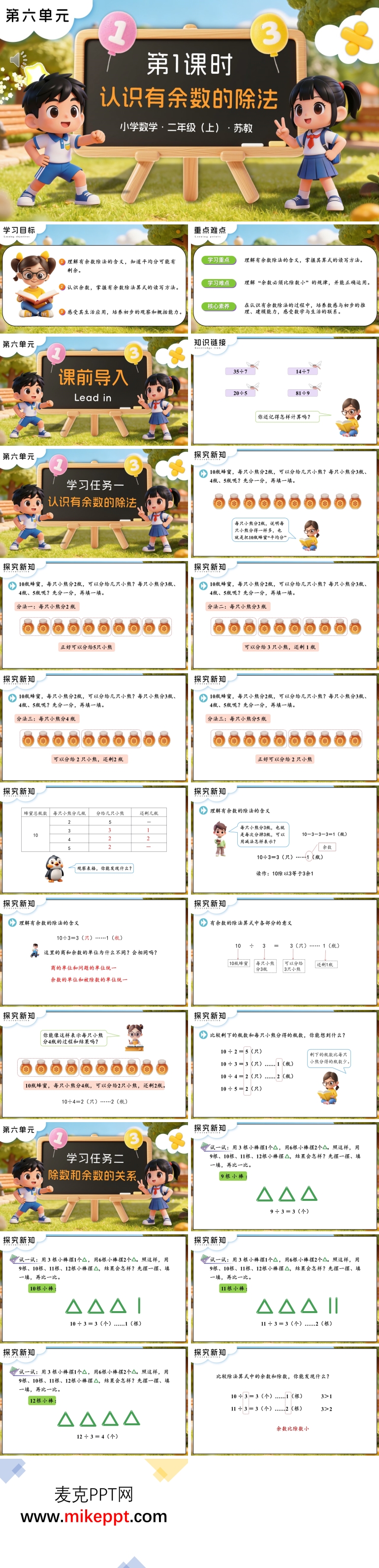 这是一份苏教版小学数学二年级上册第六单元第1课时“认识有余数的除法”的PPT课件,专注于帮助学生初步建立对有余数除法的基础认知。该课件以“学习目标 - 探究新知 - 课堂练习”为教学脉络,通过清晰的教学结构,引导学生逐步理解有余数除法的含义及其核心规则。 在教学设计上,课件首先明确了本节课的学习目标,即让学生认识有余数除法的含义,掌握除法算式中各部分的名称(被除数、除数、商、余数),并理解“余数小于除数”的关系。同时,课件点明了本节课的重难点,即帮助学生理解有余数除法的概念以及“余数小于除数”这一核心规则。 在“探究新知”环节,课件设计了两个任务来引导学生逐步掌握有余数除法的基本概念。第一个任务通过“分气球、分铅笔”的具体情境(例如将10个气球平均分成3份)引出“分后有剩余”的情况。通过这种贴近生活的实例,学生能够直观地感受到有余数除法的实际应用场景,并同步介绍有余数除法的算式写法,明确被除数、除数、商和余数的名称。这种情境化的教学方式帮助学生将抽象的数学概念与实际生活联系起来,增强了他们的理解能力。 第二个任务通过分不同数量的小棒(10-12根)的操作活动,引导学生自主发现“余数总比除数小”的核心规则。通过实际操作,学生能够清晰地看到,当余数大于或等于除数时,说明还可以继续分配,从而进一步理解“余数小于除数”的逻辑关系。这种探究式学习不仅激发了学生的学习兴趣,还培养了他们的观察和分析能力。 在“课堂练习”环节,PPT搭配了分圆片、分花等实际题目,帮助学生巩固对有余数除法的认知和规则应用。这些练习题通过多样化的形式,进一步强化学生对有余数除法的理解,使他们能够在不同的情境中灵活运用所学知识。 在视觉设计上,PPT采用了卡通元素结合直观分物场景的方式,贴合二年级学生的认知特点。这种设计不仅使课堂更加生动有趣,还通过具象化的操作场景,将抽象的数学概念转化为直观的操作过程,帮助学生更好地理解有余数除法的含义与核心规律。通过这样的教学设计,学生能够在轻松愉快的氛围中掌握有余数除法的基础知识,为后续学习奠定坚实的基础。