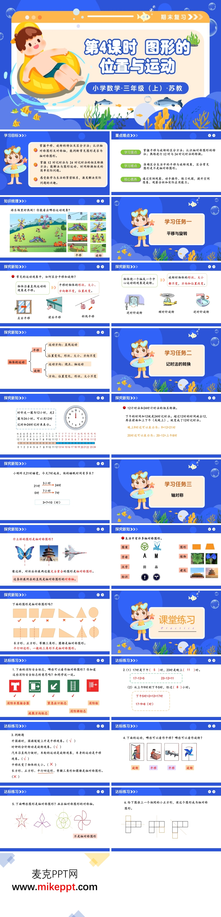 这份苏教版三年级上册期末复习课件以“图形的位置与运动”为主题,将平移与旋转、12/24时转换、轴对称图形三大板块串成一条“会看—会判—会算—会画”的能力链,帮助学生系统梳理图形运动和时间换算的核心要点。开篇用游乐园快闪视频导入:过山车沿轨道直线飞驰→平移,摩天轮绕轴圆周转圈→旋转,学生边看边用手势模仿运动轨迹,教师顺势提炼“平移三不变”(形状、大小、方向)和“旋转一变”(方向),再配生活实例(推拉门、风扇叶片)加深印象。 12/24时转换用“时间魔法表”动画演示:上午8:00不变,晚上8:00指针自动+12变成20:00,反之20:00减12回晚上8:00,口诀“过12加12,回12减12”同步闪现;随后抛出“计算睡眠时间”任务——21:30到次日6:30,学生先在时间轴上分段画图,再列式换算,系统即时反馈正确率,教师针对“跨中午12点”易错点再讲解。 轴对称板块先用“对折剪纸”微课:蝴蝶、爱心、字母A依次对折,完全重合的打√,不对称的打×,学生直观理解“对折后两边重合”即为轴对称;再出示长方形、正方形、平行四边形、梯形,让学生用平板拖动“对称轴”工具验证,发现长方形有2条、正方形有4条、平行四边形一般没有,及时纠正“对角线即对称轴”的迷思。 课堂练习采用“三关挑战”:①运动现象判断——给GIF贴“平移”或“旋转”标签;②时间换算——把电影开场时间从24时转成12时;③轴对称——在方格纸补全另一半图形并画对称轴。每关完成即得电子勋章,教师依据数据当场讲评,确保知识过手。 总结用“一张图”思维导图:平移旋转看方向,12/24时看12,轴对称先对折再画轴。整份课件用“动画情境—口诀转换—操作验证—游戏闯关”四连击,让图形运动看得见、时间换算摸得着、对称轴画得出,既提升空间观念,又强化生活应用,为期末综合解决图形与时间类题目奠定扎实的方法与信心双重基础。