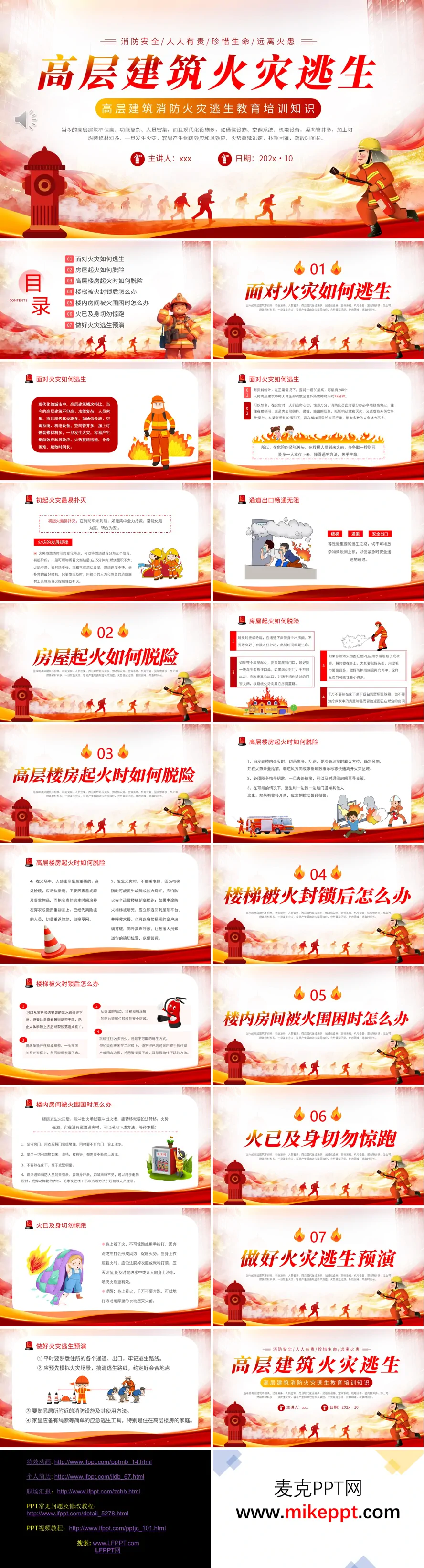 这是一套高层建筑火灾逃生知识培训PPT,主题为"消防安全,人人有责;珍惜生命,远离火患"。内容针对高层建筑火灾特点(烟囱效应、蔓延快、疏散难),系统讲解七个关键逃生要点:火灾应急逃生原则、房屋起火自救方法、高层楼宇疏散技巧、楼梯被封锁时的替代方案、被困室内待援措施、身上着火的正确处置,以及日常逃生预演的重要性。材料强调"生命第一",提供湿毛巾捂口鼻、低姿前进、不乘电梯、结绳自救等实用方法,并建议熟悉逃生路线、常备应急工具。全文约3000字,配以图示说明,适用于社区、企业及学校消防安全教育,帮助公众掌握关键自救技能。