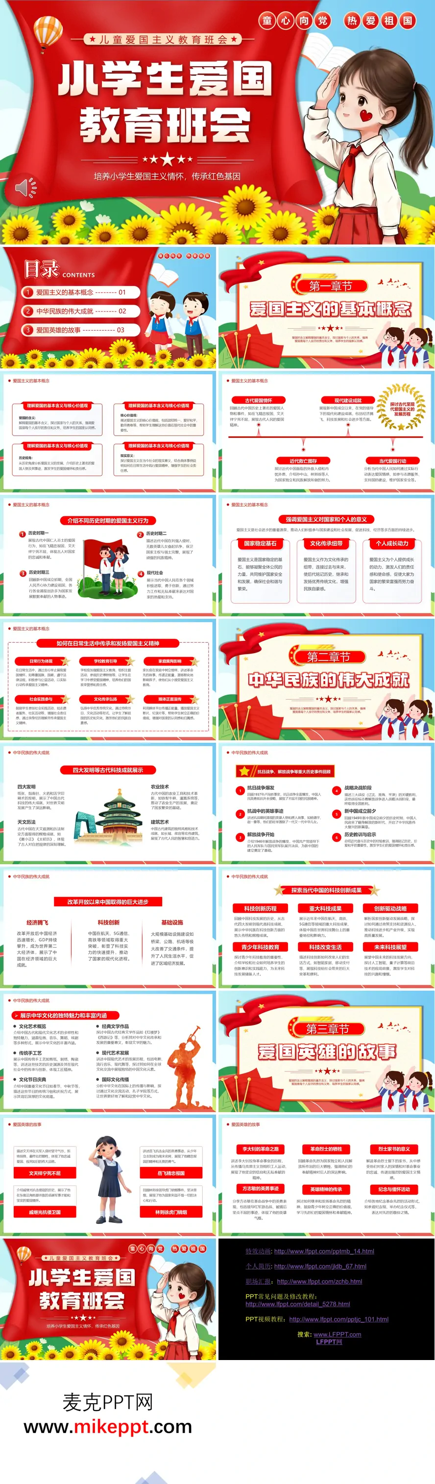 这套PPT以“童心向党,热爱祖国”为主题,是一份面向小学生的爱国主义教育班会材料。其内容结构清晰,旨在通过三个核心章节,循序渐进地培养小学生的国家认同感和爱国情怀。 PPT首先从“爱国主义的基本概念”入手,解释了爱国的含义,并贯穿古今,通过岳飞、文天祥等历史人物和近代救亡图存的史实,阐述了爱国主义的发展与核心价值观。其次,在“中华民族的伟大成就”章节,PPT展示了从古代四大发明到当代科技创新的辉煌成果,以及改革开放以来的巨大进步,旨在激发学生的民族自豪感。最后,“爱国英雄的故事”章节通过讲述文天祥、戚继光、李大钊等英雄人物的感人事迹,将爱国精神具体化、人格化,让抽象的情感变得可感可学。 整体上,该文档注重历史与现实相结合,知识性与教育性并重,通过丰富的图文内容引导小学生在了解祖国、崇敬英雄的过程中,自然而然地传承红色基因,树立正确的价值观。