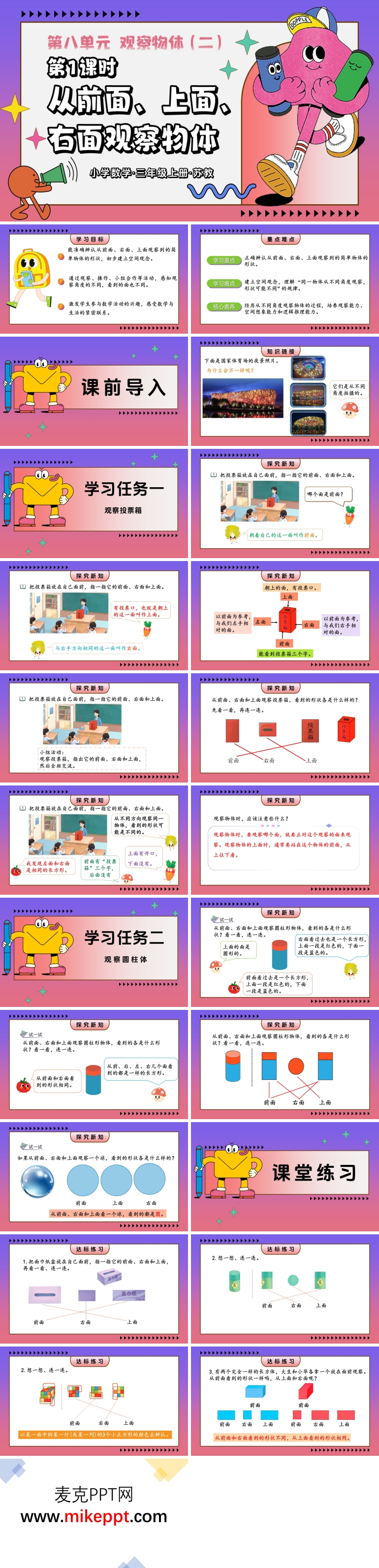 这份苏教版三年级上册“观察物体(二)”新授课课件,以“视角切换—形状辨认—规律归纳—操作巩固”为主线,借助国家体育场、投票箱、圆柱组合体等真实素材,引导学生经历“指—看—连—想”的完整观察过程,初步建立空间观念。课前导入先用鸟巢四张不同角度的航拍照片冲击视觉:正面、侧面、俯视、仰视依次闪现,学生脱口而出“形状不一样”,教师顺势提炼核心命题:“观察角度不同,看到的形状可能不同”,为整节课奠定探究基调。 学习任务一聚焦“投票箱三视图”。教师将实物置于讲台,先让学生用身体定向:胸口对着的面是“前面”,右手方向是“右面”,头顶上方是“上面”,动作记忆帮助概念落地;随后屏幕呈现三幅剪影,学生用平板拖拽对应名称,完成“指认—连线”匹配,系统即时反馈,错误视角立刻放大旋转,帮助学生矫正空间方位。 学习任务二升级到“圆柱组合体”。学生分组领取积木,合作摆出“底面圆柱+上层小正方体”造型,再从三个方向拍照上传,教师对比展示:前面、右面均出现长方形,上面则出现圆+正方形组合,学生自己总结出“圆柱看顶是圆,看侧是长方形”的视角规律,并用便利贴贴在桌面,形成可视化结论。 课堂练习采用“双通道”:基础层“指一指”——教师随机旋转模型,学生快速说出当前视角;提高层“连一连”——给出三视图,小组合作摆出唯一造型,系统根据用时与准确度颁发“空间小达人”电子勋章,激发参与热情。 总结环节用“三句话”口诀收束:胸对前面,右手指右面,头顶是上面;圆柱侧面长方形,顶面圆形别混淆。课后任务布置“家庭三视图”:拍摄家中同一物体三个角度照片,下周分享并标注视角名称,实现课堂到生活的延伸。 整份课件用“航拍冲击—实物指认—积木合作—游戏闯关”四连击,让抽象的空间方位变成看得见、指得出、连得上的具体活动,既训练视角辨认,又培养空间想象,为后续复杂组合体三视图及表面积计算奠定坚实的观念与兴趣双重基础。