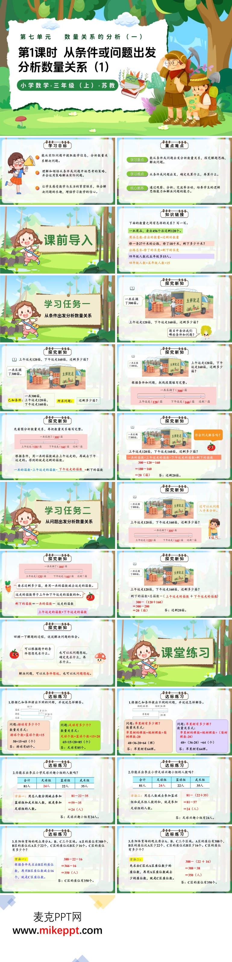 这份苏教版三年级上册第1课时新授课课件以“从条件或问题出发分析数量关系”为主题,遵循“唤醒旧知—双向建模—对比提炼—应用迁移”的链路,让学生第一次系统体验“条件→能求什么”与“问题→需要什么”的双视角解题策略。导入环节用“口算接龙”快速激活加减互逆:给出“一共300箱,上午运120箱”,学生脱口补充“下午运180箱”,教师追问“你是先想什么?”顺势点明“从条件出发可以推新知”。 学习任务一呈现“运蔬菜”完整情境:屏幕左侧滚动显示“一共摘300箱、上午运120箱、下午运160箱”,右侧留空。教师引导学生从条件想:知道“上午120+下午160”能先求“已运走”280箱,再用“300-280”得剩余20箱;同时用线段图分段着色,把“总—部分—剩余”关系可视化,提炼“条件出发,先拆再算”的口诀。 学习任务二反向切入:只出示问题“还剩多少箱?”和“总300箱”,其余信息打码。学生讨论发现需知道“运走多少”,教师再逐条解锁“上午120、下午160”,学生经历“问题→缺信息→补条件→列式”的完整逆向过程,感悟“问题出发,缺啥补啥”。 对比总结用“双向箭头”板书:条件出发向右推,问题出发向左找,交汇点都是“总-部分=剩余”。课堂练习设计“三梯度”:①基础提问题——给条件让学生提两个不同问题并列式;②提高补条件——给问题让学生补一个条件再解答;③拓展画线段——用线段图表示“合唱队女生比男生多12人”并求总人数。系统实时批改,教师针对错例再演示,确保策略落地。 整份课件用“情境动画—线段图示—双向对比—梯度应用”四连击,让数量关系分析从文字描述走向图表模型,既训练思维条理,又提升表达完整度,为后续复杂和差倍问题奠定坚实的方法与信心双重基础。