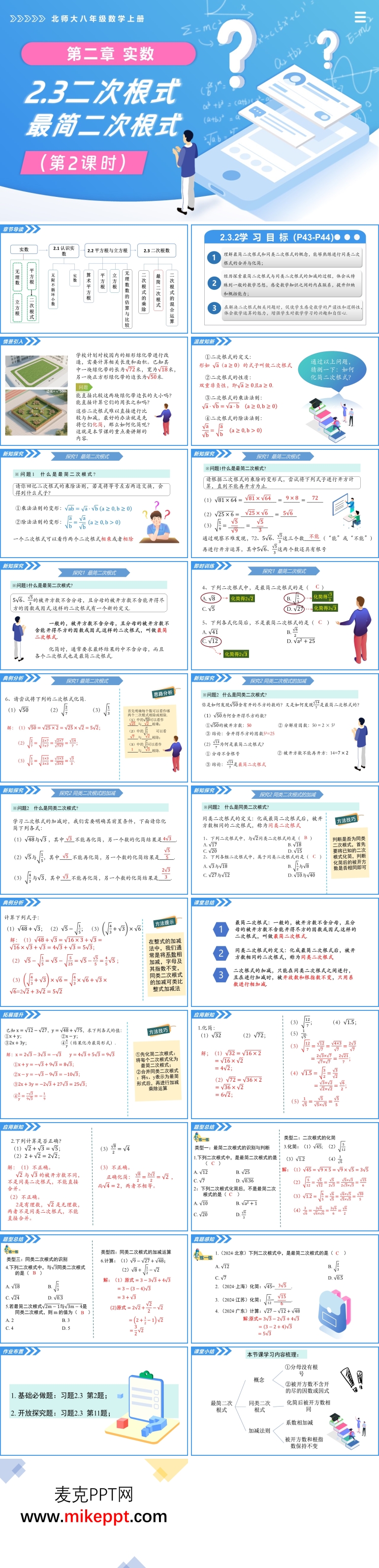 本套 PPT 是为北师大版八年级数学上册《实数》章节中的 “2.3 二次根式” 第二课时——“最简二次根式” 设计的。它围绕 “最简二次根式” 的核心概念,为学生设定了三个明确的学习目标:首先,让学生准确理解并掌握最简二次根式的定义;其次,培养学生将复杂的二次根式化简为最简形式的能力;最后,使学生能够熟练进行同类二次根式的合并运算。 在内容设计上,PPT 开篇先带领学生回顾二次根式的定义与基本性质,帮助学生巩固已学知识,为新知识的学习做好铺垫。随后,PPT 引入最简二次根式的关键特征——被开方数中既不能含有分母,也不能包含能够完全开方的因数或因式。通过具体的例题,引导学生判断哪些二次根式属于最简二次根式,帮助学生初步建立对最简二次根式的直观认识。 接下来,PPT 重点讲解了二次根式的化简方法,其中特别强调了分母有理化这一技巧。例如,通过将一个分数形式的二次根式进行配乘操作,使其分母变为有理数,从而实现化简。同时,PPT 引入了同类二次根式的概念,明确指出只有当两个二次根式在化简后被开方数相同时,它们才能进行合并运算。为了帮助学生更好地理解这一规则,PPT 配备了相应的加减运算例题,让学生在实际操作中体会同类二次根式的合并方法。 此外,PPT 还设计了多种类型的练习题,包括判断题、化简题和运算题,让学生在反复练习中加深对知识的理解和运用。最后,通过梳理知识框架,帮助学生系统地回顾和巩固最简二次根式的判定方法、化简技巧以及同类二次根式的运算规则等重要知识点,助力学生构建完整的知识体系,为后续的数学学习打下坚实的基础。