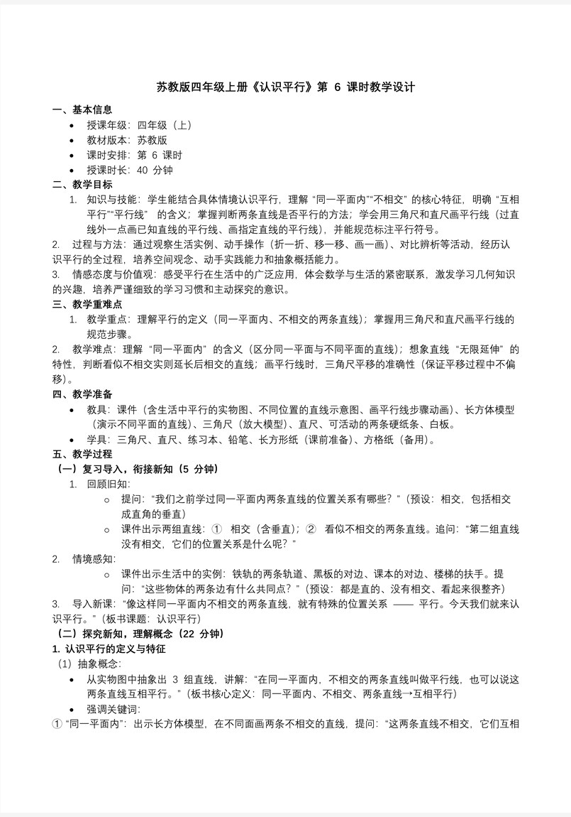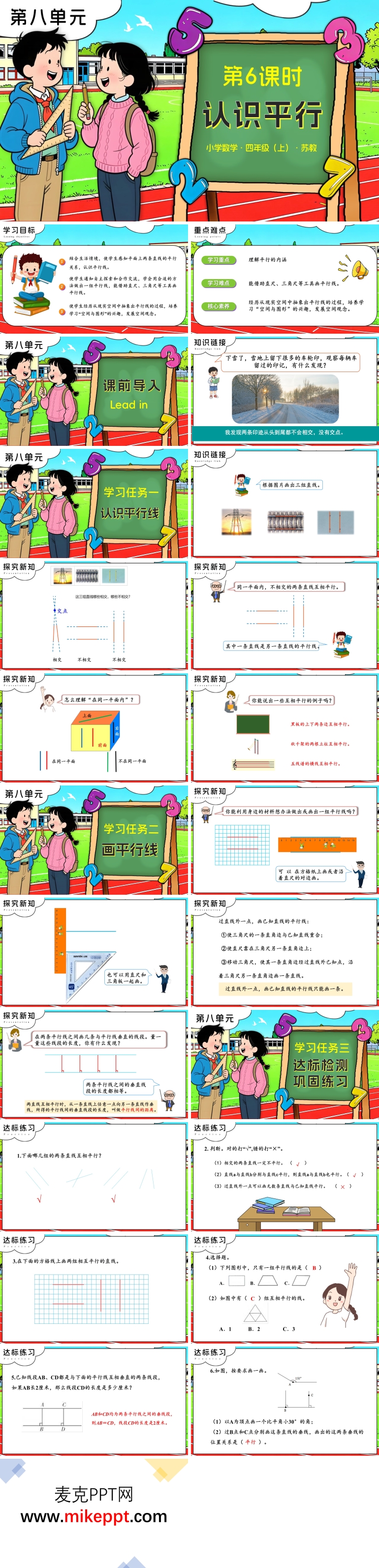 这是一套针对苏教版四年级数学上册第八单元第 6 课时设计的 PPT 课件,主题聚焦于 “认识平行”。该课件旨在通过系统的学习设计,帮助学生深入理解平行线的概念,掌握平行线的画法,并在此过程中培养学生的空间观念和操作能力。其中,理解平行的内涵以及规范画出平行线是本次课的重点和难点。 在内容编排上,PPT 采用了 “生活导入 - 概念认知 - 实操练习” 的结构,充分贴合四年级学生的认知规律。首先,通过生活中的实际场景导入,如道路、铁轨等,直观地呈现平行线的特征——“同一平面内永不相交”,从而激发学生的学习兴趣,为后续学习奠定基础。 进入学习任务一 “认识平行线”,PPT 通过图形对比,展示相交与不相交的直线,帮助学生明确平行线的概念。同时,结合电线杆、直尺等生活中的实例,进一步强化学生对平行线的认知,使抽象的数学概念与实际生活紧密相连,帮助学生更好地理解和记忆。 学习任务二 “画平行线” 是本课的重点环节。PPT 详细讲解了使用直尺和三角尺画平行线的具体步骤,包括如何放置工具、如何操作以确保线条平行等。此外,还介绍了过一点画已知直线平行线的方法,通过逐步演示和详细说明,帮助学生掌握规范的作图技巧,提升操作能力。 最后,学习任务三 “达标检测” 通过多样化的习题设计,如判断题、画图题、选择题等,全面巩固学生对平行线的识别与绘制能力。这些练习题不仅检验学生对概念的理解,还考察学生将知识应用于实际操作的能力,确保学生能够扎实掌握平行的核心知识与技能。 整套 PPT 以实例为基础,结合实操练习,通过生动形象的导入、清晰明确的概念讲解以及系统全面的练习设计,帮助学生逐步建立起对平行线的深刻理解,并熟练掌握平行线的画法。这种设计方式不仅符合四年级学生的认知特点,还能有效提升学生的学习效果,为学生后续的几何学习打下坚实的基础。