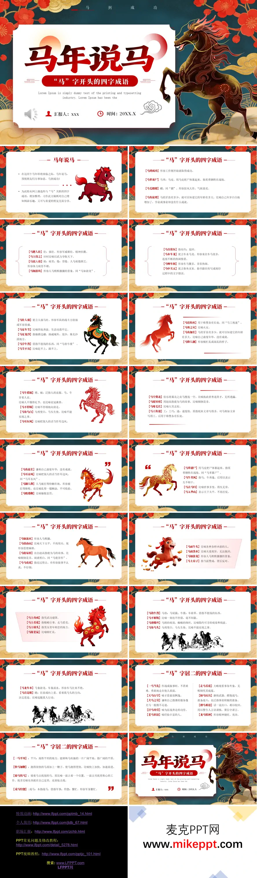 这套PPT以“马年说马”为主题,结合农历马年的背景,集中展示了与“马”相关的汉语成语文化。整体内容分为两大部分:一是“马”字开头的四字成语,二是“马”字位于第二位的四字成语,结构清晰,旨在通过成语介绍传递祝福、增长知识并增添趣味。 PPT开头以“马到成功”点题,寓意新年伊始即获成功,营造出吉祥的节日氛围。随后系统性地罗列了数十个“马”字开头的成语,如“马革裹尸”“马不停蹄”“马首是瞻”等,每个成语均配有简明解释,涵盖军事、生活、人生哲理等多方面,既展现了汉语的丰富性,也暗含对品德、毅力的推崇。第二部分则列举了“一马当先”“天马行空”“老马识途”等“马”居第二的成语,进一步扩展了文化内涵,强调经验、行动与精神层面的意义。 整体设计虽以文字为主,但通过分点排版和重复标题强化了节奏感,结尾再次呼应主题,突出“马”作为吉祥符号的象征意义。内容兼具教育性与实用性,既适合节日祝福,也可作为语言文化的普及材料。