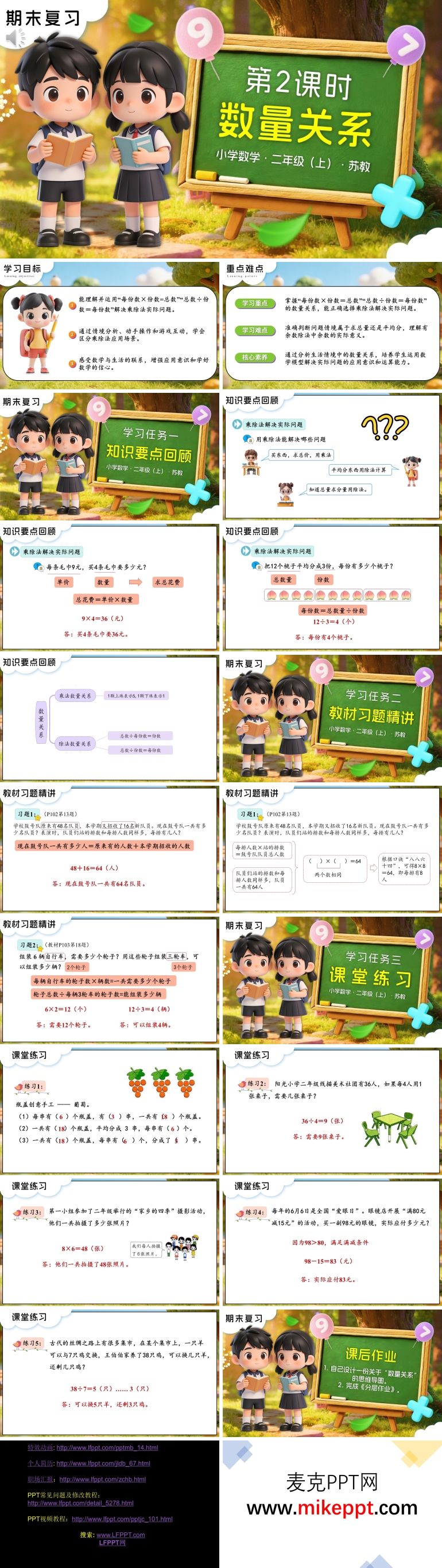 这是一套专为苏教版二年级数学上册期末复习设计的第 2 课时课件,主题聚焦于 “数量关系” 板块。该课件旨在通过系统的复习,帮助学生掌握 “倍”“乘加乘减” 等核心数量关系,并能够结合实际情境正确列式解题,从而提升学生对数量的分析能力和运算应用能力。其中,理清不同场景下的数量逻辑,以及准确选择合适的运算方法是本次复习的重点和难点。 在内容编排上,PPT 采用了 “知识梳理 - 习题精讲 - 课堂练习” 的结构,层次清晰,循序渐进。在知识梳理环节,PPT 首先对 “每份数、份数、总数” 之间的倍数关系进行了系统的回顾,帮助学生明确这些概念之间的内在联系。同时,通过具体的例子,辨析了 “求几倍” 和 “求总数” 的不同表述方式,让学生能够准确区分这些常见的数量关系。此外,还明确了乘加乘减运算的适用场景,为学生在实际解题中选择正确的运算方法提供了理论支持。 进入习题精讲环节,PPT 结合购物、物品分配等贴近学生生活的情境,详细讲解了数量关系的转化。例如,通过实例引导学生理解 “几个几” 的表述对应乘法运算,帮助学生将抽象的数量关系与具体的生活场景相结合,从而更好地理解和掌握数学知识。这种结合实际情境的教学方式,不仅能够激发学生的学习兴趣,还能帮助他们更好地理解数学知识在生活中的应用。 在课堂练习部分,PPT 设计了多样化的题型,如水果分组、座位安排等,通过这些具体的练习题,进一步巩固学生对倍数关系、乘除混合运算等数量分析的理解和应用能力。这些练习题不仅涵盖了本单元的重点知识,还通过不同的情境设计,帮助学生在实际操作中加深对数量关系的理解,提升解题能力。 整套 PPT 以二年级学生的认知特点为基础,通过生活实例串联知识点,将抽象的数学概念与具体的生活场景相结合,帮助学生在轻松愉快的氛围中理清数量逻辑,扎实掌握期末复习中的高频考点。这种设计不仅符合学生的心理发展规律,还能够有效提升学生的学习效果,为学生在期末考试中取得优异成绩提供有力支持。