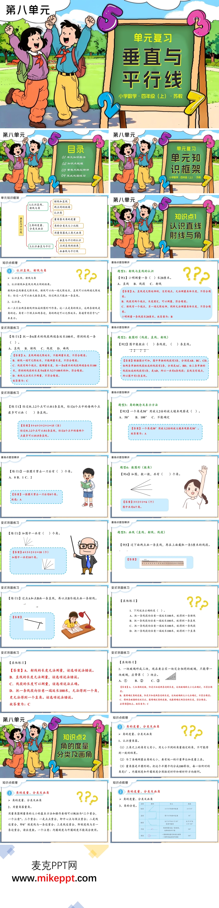 这套 PPT 是专为苏教版四年级上册数学第八单元 “垂直与平行线” 打造的单元复习资料,整体风格活泼生动,巧妙融入了卡通人物元素,充分契合小学生的认知特点,能够有效吸引他们的注意力,激发学习兴趣。 PPT 以清晰的单元目录和知识框架作为开篇内容,这有助于学生对本单元的核心知识脉络进行梳理,搭建起完整的知识体系,为后续的复习奠定坚实基础。之后,PPT 分为两大主要知识点展开深入讲解。第一个知识点是 “认识直线、射线与角”,这部分内容详细阐述了直线、射线、线段的概念以及它们之间的区别,让学生能够准确区分这三种基本的几何图形。同时,深入讲解了角的形成原理,使学生明白角是如何产生的。为了巩固这些概念,PPT 配套了丰富的练习题,包括填空题、选择题等,题型多样。例如,通过判断线段延长后的图形,引导学生思考线段与直线、射线之间的关系;还有数角的个数的题目,让学生在实际操作中加强对角的认识,通过这些实例进一步强化概念辨析,帮助学生深入理解知识要点。 第二个知识点是 “角的度量、分类及画角”。PPT 对量角器的使用方法进行了详细讲解,让学生掌握如何正确使用量角器来测量角的大小。接着,对角的分类进行了系统梳理,包括锐角、直角等不同类型角的特点和定义,使学生能够准确辨别各种角。此外,还详细介绍了画角的步骤,让学生学会如何按照要求画出不同度数的角。为了提升学生的实践能力,PPT 搭配了量角计算题和画角实操题,让学生在动手操作中巩固所学知识。同时,还精心设置了易错题,比如关于射线长度判断的题目,通过这些易错题的讲解和分析,帮助学生规避常见的认知误区,避免在学习过程中出现错误。 整套 PPT 采用了 “知识回顾 + 针对性练习” 的模式,这种模式既注重对核心知识点的梳理和回顾,又通过多样化的练习题型,兼顾了学生对知识技能的训练和巩固。它既适合在课堂上进行集体复习,教师可以引导学生一起回顾知识、解答练习题,共同探讨解题方法,营造良好的学习氛围;也适合学生课后自主巩固学习,学生可以根据自己的学习进度和掌握情况,自主安排复习内容,查漏补缺。通过使用这套 PPT,能够助力学生扎实地掌握本单元的核心知识,提升解题能力,为后续的数学学习奠定坚实基础。