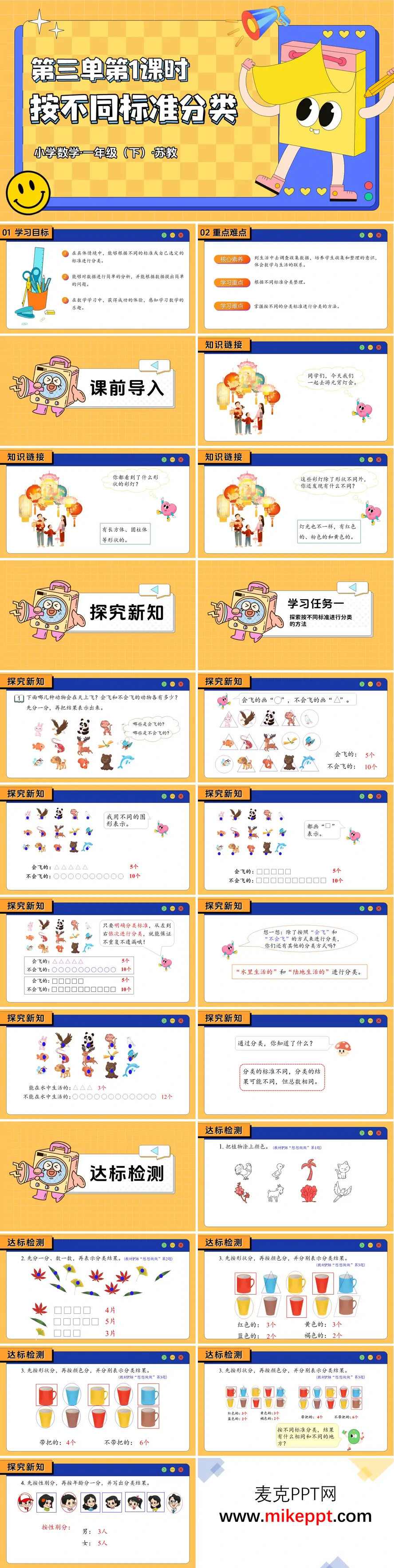 这份低年级数学第1课时课件以“按不同标准分类”为核心,通过“灯会激趣—动物探究—多元练习—反思评价”四环递进,让学生在动手、动口、动脑的过程中体验分类的价值与乐趣。导入环节先用元宵灯会航拍:红圆灯、黄方灯、蓝椭圆灯交错闪烁,教师提问“如果让你挂灯,你会怎么分组?”学生脱口而出“按颜色”“按形状”,分类意识瞬间被点燃。 探究新知以“动物派对”情境展开:屏幕先呈现8只动物(小鸟、小鱼、小兔等),学生用拖拽方式尝试分类,第一次按“会飞/不会飞”把小鸟放进天空框、其余放进草地框,教师强调“一只都不能重复”;第二次再按“水里生活/陆地生活”重新分,发现小鱼去了水池、小兔留在草地,小鸟既可飞又住树,引发“交叉讨论”,最终得出“标准不同结果不同,但总数始终不变”的核心结论。分类结果用不同符号(★、●、■)记录,渗透简单统计思想。 练习设计层层拓展:①“给植物涂色”——按阔叶/针叶涂绿或黄,既练分类又练色彩;②“玩具大整理”——先按形状分,再按颜色分,两次结果对比,强化“标准变、类别变”;③“人群分类”——按性别和年龄双重标准分,引导学生发现“同时满足两个条件”的交集概念,为后续统计表奠基。 总结用“一张思维导图”收束:分类前先选标准,再数个数,最后比较总数;自我评价从“我敢举手、我会合作、我肯思考”三面打分,小组互评贴星星,让情感目标与知识目标同频提升。 整份课件用“生活情境—动手拖拽—符号记录—反思互评”四连击,让分类从单纯“分一分”上升为“收集—整理—比较”的初步统计过程,既培养数据意识,又渗透有序思维,为后续学习简单统计表和条形图奠定坚实而有趣的基础。