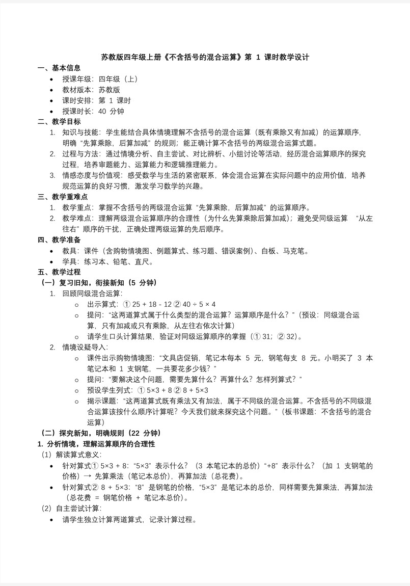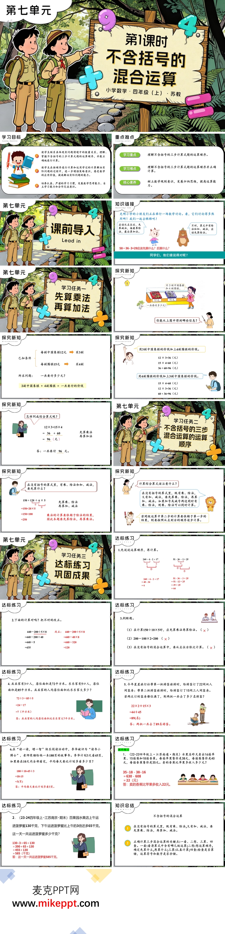 这是一套专为四年级学生设计的苏教版数学第七单元第 1 课时新课 PPT,主题聚焦于 “不含括号的混合运算”,采用充满趣味的探险风卡通元素,生动形象,能够充分吸引四年级学生的注意力,契合他们的认知特点。 在课程伊始,PPT 明确地提出了学习目标,即让学生熟练掌握不含括号的混合运算顺序,同时精准地指出了本节课的重难点,让学生在学习之初就对重点内容有所了解,为后续的学习指明方向。课前导入环节巧妙地通过旧知回顾进行铺垫,帮助学生唤醒已有的知识记忆,为新知识的学习搭建起稳固的桥梁,使学生能够更加顺畅地过渡到新内容的学习中。 核心内容分为三个学习任务。首先,以贴近学生生活的 “买笔记本和书包” 的购物实例为切入点,引导学生在解决实际问题的过程中推导乘加类运算的顺序,通过生动的情境让学生直观地感受到在混合运算中需要先算乘法再算加法,这种实例探究的方式能够让学生在具体情境中理解抽象的运算规则,使数学知识更具生活气息和实际意义。 接着,PPT 对不含括号的三步混合运算顺序进行了详细讲解,清晰地阐述了 “先乘除、后加减,同级运算从左到右” 的规则,并结合具体的例题进行演示,逐步展示计算步骤,让学生能够清晰地看到每一步的运算过程,加深对运算顺序的理解和记忆。这种规则总结与例题演示相结合的方式,既让学生明白了运算规则的理论依据,又通过实际操作让学生能够熟练掌握计算方法。 在达标练习环节,精心设计了多种类型的题目,包括运算顺序判断题、计算改错题,以及买票、看书页数等生活应用题。这些题目形式多样,既考察了学生对运算顺序的判断能力,又通过改错题让学生能够及时发现并纠正错误,进一步巩固所学知识。生活应用题则将数学知识与实际生活紧密联系起来,让学生在解决实际问题的过程中强化对运算规则的运用,提高学生的数学应用能力,使学生感受到数学知识在生活中的广泛应用。 最后,在课程结尾部分,PPT 对本节课所学的核心运算顺序进行了系统梳理,帮助学生对所学知识进行回顾和总结,加深对运算逻辑的理解和记忆。同时,配套的课后作业进一步深化巩固了学生的学习成果,让学生在课后能够继续巩固和拓展所学知识。 整套 PPT 以 “实例探究 + 规则总结 + 练习强化” 的教学模式推进,环环相扣,层层递进,符合学生的认知规律。通过生动有趣的探险风卡通元素设计,激发了学生的学习兴趣;通过实例探究让学生在具体情境中理解运算规则;通过规则总结让学生系统掌握知识要点;通过练习强化让学生熟练运用所学知识解决实际问题。这种教学模式能够有效帮助学生掌握不含括号混合运算的计算逻辑,是一份极具实用性和趣味性的课堂新授资料,能够为四年级学生的数学学习提供有力支持,助力他们在数学学习的道路上迈出坚实的步伐。