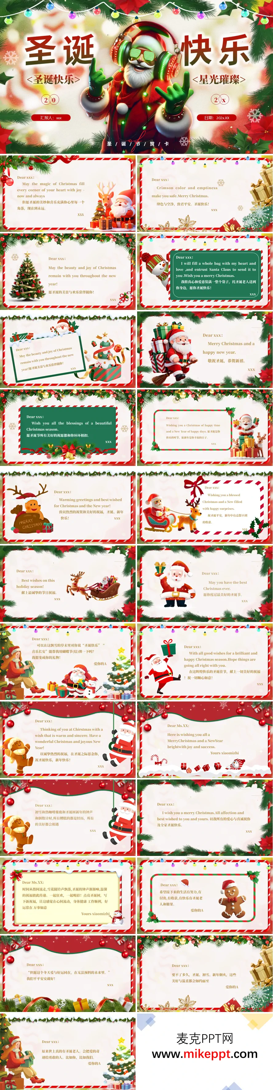 这是一套以"圣诞快乐"为主题的节日贺卡PPT模板,共包含20余页精美设计方案。整体采用星光璀璨的视觉风格,每页均以"Dear xxx"书信格式展开,配有温馨的圣诞祝福语和虚拟署名栏,便于用户直接替换使用。 内容涵盖中英文双语祝福,包括经典寄语如"愿圣诞的魔力填满你心灵的每个角落"、"愿圣诞美景与欢乐常伴你全年"等,以及充满童趣的"我将装满一整袋心意托付圣诞老人送给你"。设计元素丰富多样,运用了大量星号装饰线、几何图形标记(如發N、Wm V等)和节日符号,营造出浓厚的圣诞氛围。 模板提供多种版式选择,从简洁的单句祝福到图文结合的精美排版,底部统一标注"圣/诞/节/贺/卡"标识。最后一页以"祝你圣诞快乐"收尾,形成完整呼应。这套模板非常适合制作电子贺卡、节日汇报或商务祝福,兼具美观性与实用性,用户只需修改称呼和署名即可快速生成个性化圣诞祝福。