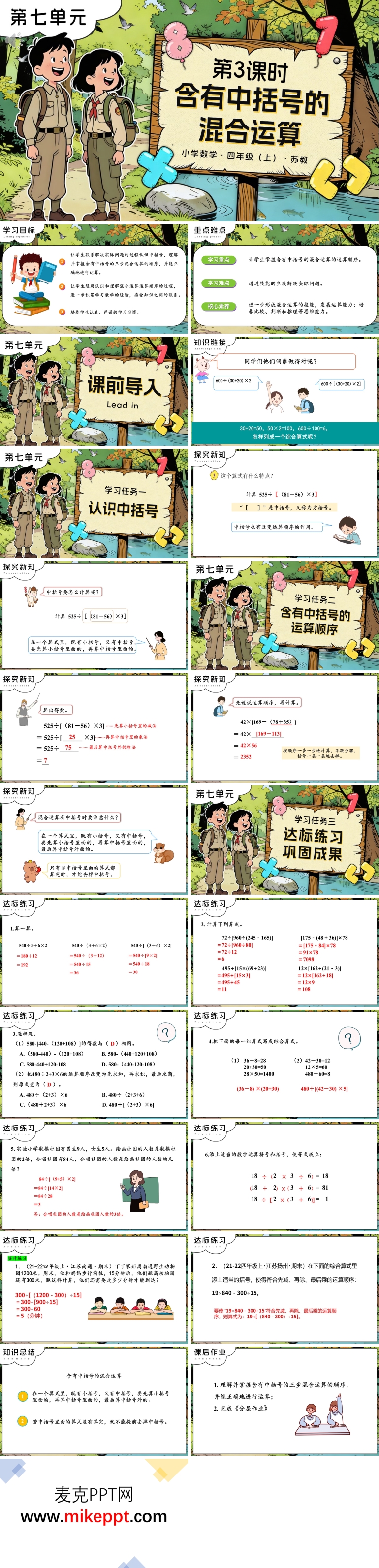 这是一套专为四年级学生设计的苏教版数学第七单元第3课时新课PPT,主题聚焦于“含有中括号的混合运算”,延续了探险风卡通设计风格,色彩鲜明、形象生动,充满趣味性,能够充分吸引四年级学生的注意力,激发他们的学习兴趣,同时契合学生的认知特点,帮助他们更好地理解和掌握知识。 在课程开始时,PPT 明确地提出了学习目标,即让学生熟练掌握含有中括号的混合运算顺序,同时清晰地指出了本节课的重难点,让学生在学习之初就对重点内容有所了解,为后续的学习指明方向。课前导入环节通过旧运算顺序的辨析,引出中括号的学习需求,帮助学生建立起新旧知识之间的联系,使学生能够更加顺畅地过渡到新内容的学习中,为理解含有中括号的混合运算顺序奠定基础。 核心内容分为三个学习任务。首先,介绍中括号(又称方括号)的标识及改变运算顺序的作用。通过生动形象的讲解,让学生了解中括号在混合运算中的重要性,以及它与小括号的区别和联系。这一环节帮助学生初步认识中括号,为后续的运算规则学习做好铺垫。 接着,以例题“525÷[(81-56)×3]”为例,详细讲解了含有中括号的混合运算顺序,即“先算小括号内、再算中括号内、最后算括号外”的规则,并逐步演示分步计算步骤。通过具体的例题,让学生清晰地看到每一步的计算依据和过程,帮助学生理解中括号在运算中的优先级,以及如何正确地进行分步计算。这一环节让学生在具体情境中掌握含有中括号的混合运算的计算方法,提高学生的运算能力。 在达标练习环节,精心设计了多种类型的题目,包括计算题、运算顺序选择题、拆分式列综合算式,以及社团人数、动物园行程等贴近生活实际的应用题。这些题目形式多样,既考察了学生对含有中括号的混合运算顺序的掌握情况,又通过生活应用题让学生将所学知识运用到实际问题中,强化了学生对运算规则的实际运用能力,使学生感受到数学知识在生活中的广泛应用,提高了学生解决实际问题的能力,进一步加深了学生对含有中括号的混合运算的理解。 最后,在课程结尾部分,PPT 对本节课所学的核心要点进行了系统梳理,帮助学生对所学知识进行回顾和总结,加深对含有中括号的混合运算计算逻辑的理解和记忆。同时,配套的课后作业进一步深化巩固了学生的学习成果,让学生在课后能够继续巩固和拓展所学知识,确保学生能够熟练掌握含有中括号的混合运算。 整套PPT以“旧知导入→规则探究→练习强化”的教学模式推进,环环相扣,层层递进,符合学生的认知规律。通过旧知导入,帮助学生巩固已学知识,引出新知识的学习需求;通过规则探究,让学生在具体例题中理解含有中括号的混合运算顺序;通过练习强化,让学生在多样化的题目中巩固所学知识,提高运算能力。这种教学模式能够有效帮助学生掌握含有中括号的混合运算的计算逻辑,是一份极具实用性和趣味性的课堂新授资料,能够为四年级学生的数学学习提供有力支持,助力他们在数学学习的道路上迈出坚实的步伐。