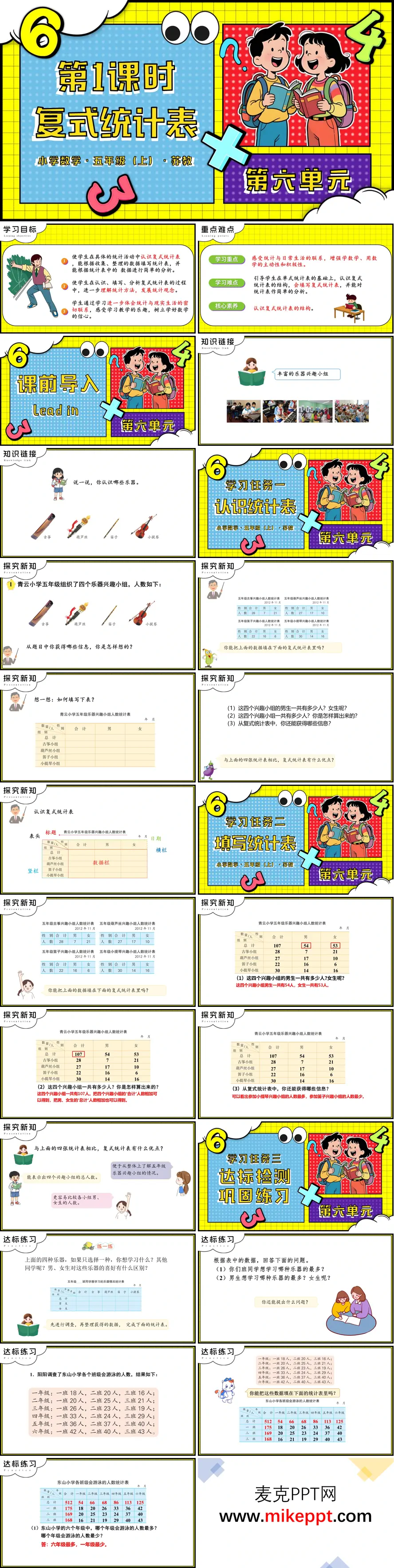 本套 PPT 为苏教版五年级上册数学第六单元 “复式统计表” 第一课时的课件。课件伊始,清晰地明确了本节课的学习目标与重难点。学习目标旨在引导学生认识复式统计表,掌握整理和分析表中数据的方法;而重难点则聚焦于让学生深刻感受统计在生活中的广泛应用,以及精准掌握复式统计表的结构。 在课前导入环节,以 “乐器兴趣小组” 为生动情境展开。首先引导学生回顾自己熟悉的乐器,唤起学生对乐器的兴趣与记忆,为后续学习营造积极氛围。随后,呈现青云小学四个乐器小组的人数数据,巧妙地从单式统计表的整理入手,逐步过渡到复式统计表的学习。在讲解复式统计表的填写方法时,详细且清晰,让学生能够逐步理解并掌握。同时,通过与单式统计表的对比,直观地指出复式统计表的优势,即更便于对多组数据进行对比分析,使学生对复式统计表有了更深入的认识。 接下来的达标练习环节,设计了 “班级游泳人数统计” 等贴近学生生活的实例,让学生在实际操作中练习填写复式统计表,并学会分析数据,如计算人数、比较数量等。此外,还设置了班级男女生人数调查的实践任务,进一步巩固学生对复式统计表的理解和运用能力,让学生在实践中体会统计的实用价值。 在最后的知识总结部分,对复式统计表的意义进行了明确阐述,即整合关联单式统计表,使数据呈现更加系统和全面。同时,梳理了复式统计表的制作步骤,包括分类整理数据、设计表头、填写数据以及核对验算等环节,帮助学生形成完整的知识体系,为今后的学习和应用打下坚实基础。