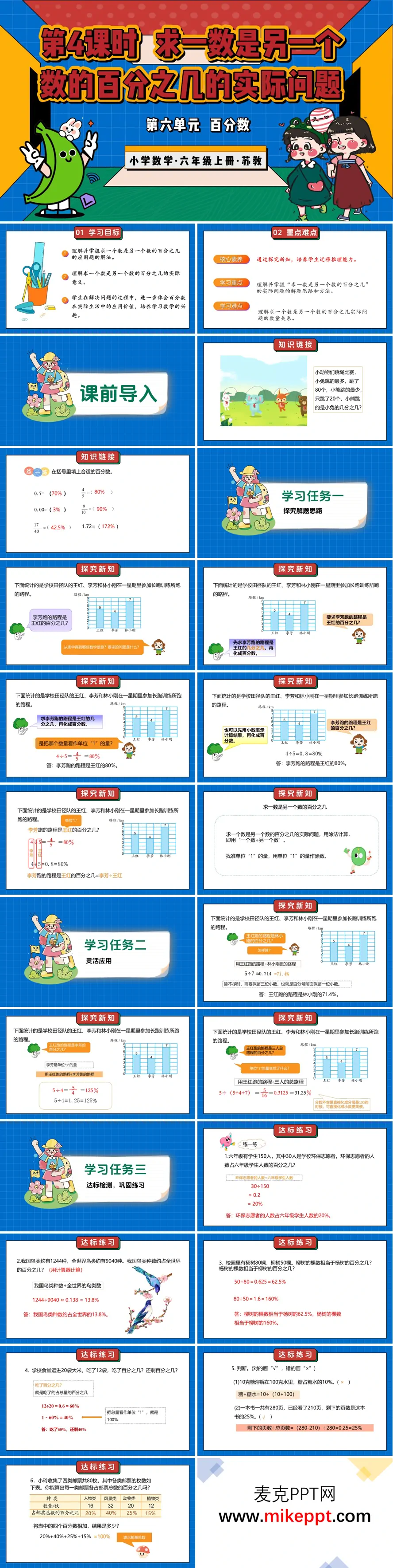 这份苏教版六年级上册第四课时课件,以“求一个数是另一个数的百分之几”为核心,沿着“情境激活—方法建模—规则提炼—应用拓展”的链路,让学生在实际问题中体会百分数“倍比”本质,掌握“一除一转”的解题套路。导入环节先用“小动物跳绳比赛”短片:小兔跳45下,小熊跳60下,谁的表现更好?学生先用分数45/60比较,教师追问“能否化成百分数更直观?”生活疑问自然链接新知。 探究新知以“田径队训练路程”展开:李芳跑400米,王红跑500米,求“李芳的路程是王红的百分之几”。学生用400÷500=0.8,再×100%=80%,动画同步呈现“除→小数→百分数”两步转化,强调“单位‘1’作除数”的铁律;接着抛出“除不尽怎么办?”用416÷700≈0.594→59.4%示范保留三位小数、百分号前一位小数的规则,板书用双向箭头标注“分数、小数、百分数”互化路径,突出“形式变,倍比不变”。 达标检测采用“生活三件套”:①人数占比——班级48人,男生28人,占比多少?②物种数量——公园里孔雀与鸽子数量对比;③物品消耗——一桶水用去百分之几,先估再精算,系统实时统计正确率,教师针对“单位1找错”“百分号漏写”再示范,确保算理落实。 总结用“三句话”口诀收束:找对单位“1”,一除得小数,小数化百分;自我评价从“我会列式、我懂转化、我肯检查”三面点赞,小组互评贴星星,让情感与知识同步提升。 整份课件用“情境冲突—方法建模—规则口诀—分层应用”四连击,让“求百分之几”从机械除法走向意义理解,既突破“理解数量关系”难点,又培养迁移推理能力,为后续折扣、利率、税率等实际应用奠定坚实而充满趣味的思维基础。