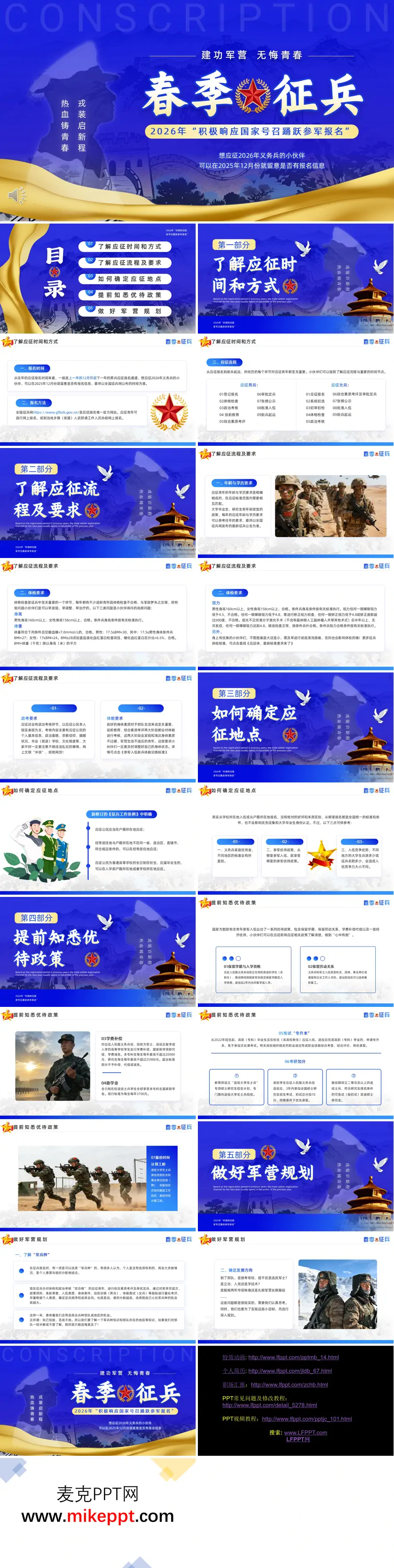 这套PPT以“建功军营无悔青春”为主题,聚焦2026年春季征兵工作,系统介绍了青年应征入伍的全流程和关键信息。内容主要涵盖五大板块:首先明确了报名时间(预计2025年12月开启)和官方渠道(全国征兵网),并列出男女兵应征的完整流程步骤;其次详细说明了年龄学历匹配要求、体检标准(如身高、体重、视力)及政考体能要求;第三部分解释了应征地点的选择原则(户籍地、高校所在地等)及其对优待政策的影响;第四部分重点梳理了国家优待政策,包括学籍保留、学费补偿、专升本免试、考研加分等权益;最后引导青年提前做好军营规划,了解军兵种选择和个人发展方向。整套内容结构清晰,旨在帮助应征青年提前掌握信息,做好参军准备。