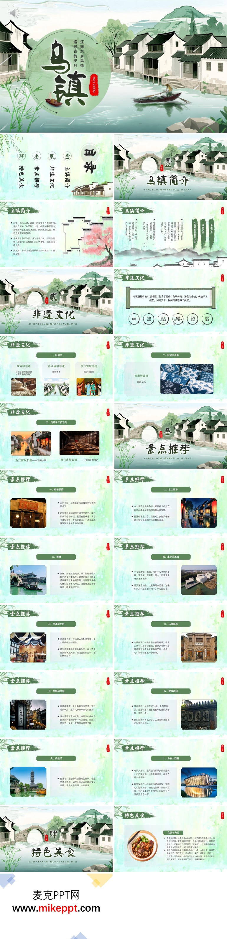 这是一份精心打造的乌镇旅游宣传演示文稿,共包含28张内容翔实的幻灯片,全面展现了这座千年古镇的独特魅力与时代价值。作为中国江南水乡的典型代表,乌镇以其"小桥流水人家"的诗意画卷,每年吸引着数以百万计的国内外游客纷至沓来。这种持续旺盛的旅游热潮,不仅直接带动了当地餐饮、住宿、交通、文创等相关产业的蓬勃发展,创造了可观的经济效益,更为乌镇居民提供了大量就业机会,有效提升了民生福祉,对促进区域协调发展、构建和谐社会产生了深远影响。难能可贵的是,在现代化浪潮席卷全球的今天,乌镇并未迷失于商业化的浮躁,而是始终坚守着深厚的文化根脉,通过创新性的保护与发展模式,让那些沉睡的非物质文化遗产重新焕发生机,使古老的民间艺术、传统技艺在当代找到新的表达方式。正因如此,乌镇早已超越了单纯的旅游景点范畴,演变成为一个集文化体验、艺术交流、精神栖居于一体的综合性文化平台,为每一位到访者提供了一场触动心灵的文化寻根之旅。 该演示文稿采用四段式结构,层层递进地展开叙述。第一部分"乌镇简介"从宏观视角切入,详细标注了乌镇地处长三角腹地、京杭大运河沿线的优越地理位置,系统梳理了东栅、西栅等核心景区的布局特色,并生动介绍了姑嫂饼、定胜糕等地方名小吃背后的文化故事,同时重点提及了乌镇作为世界互联网大会永久会址的现代意义。第二部分聚焦"非遗文化"这一灵魂支柱,深入挖掘了乌镇丰富多彩的非物质文化遗产:既有香市、庙会等承载民间信仰的民俗活动,也有蓝印花布、竹编、剪纸等享誉中外的传统工艺美术;既涵盖了手工布鞋制作、三白酒酿造等千年传承的技艺精髓,也包含了船拳、高竿船等独具水乡特色的传统体育项目,以及皮影戏、花鼓戏等雅俗共赏的民间戏曲艺术,完整构建了乌镇的文化基因图谱。第三部分"景点推荐"则化身为一位贴心的文化向导,精心筛选出昭明书院这一承载南朝文脉的千年学府、充满烟火气息的水上集市、收藏木心先生毕生心血的木心美术馆,以及白莲塔、修真观等标志性景观,为游客提供了一条深度体验乌镇文化肌理的黄金路线。最后一部分"特色美食"作为味蕾的压轴大戏,将视线投向乌镇人舌尖上的智慧,从清晨的一碗羊肉面到深夜的酱鸭馆,从街巷飘香的臭豆干到茶馆里的熏豆茶,每一道风味都承载着水乡生活的集体记忆,让文化的体验最终回归到最真实的味觉享受之中。整份文稿图文并茂,史料翔实,既是一部乌镇的立体百科全书,也是一张充满温度的文化邀请函。