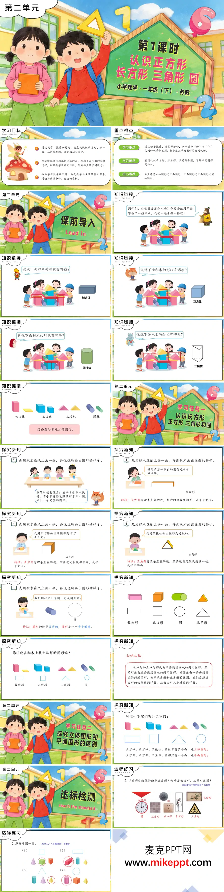 这是一套苏教版一年级下册数学第二单元第 1 课时 “认识长方形、正方形、三角形和圆” 的课件,整体设计科学合理,结构完整,涵盖学习目标、重难点、课前导入、学习任务、达标练习与总结评价等模块,为一年级学生提供了一套系统的学习方案,帮助他们初步认识四种常见的平面图形,并建立立体与平面图形之间的联系。 课件首先明确学习目标,旨在通过操作活动让学生认识长方形、正方形、三角形和圆这四种平面图形,并能够准确区分它们。同时,通过学习帮助学生建立立体图形与平面图形之间的联系,培养学生的空间观念。课件指出本节课的重难点是理解 “体” 与 “面” 的关系,以及掌握每种平面图形的特征。这种目标和重难点的明确设定,为学生的学习提供了清晰的方向,使学生能够更有针对性地进行学习。 在课前导入环节,课件以积木情境为切入点,回顾了长方体、正方体等立体图形的特征,自然过渡到新课内容。这种导入方式不仅帮助学生复习了旧知识,还为新知识的学习做好了铺垫,使学生能够更顺利地进入新课的学习。 学习任务分为两个步骤。第一步是通过 “用积木在纸上画图形” 的操作活动,引导学生认识四种平面图形的特征。例如,长方形的对边相等,正方形的四条边都相等,三角形有三条直边,而圆是由曲线围成的。通过这种直观的操作活动,学生能够亲身体验平面图形的形成过程,从而更好地理解每种图形的特征。第二步是明确立体图形与平面图形的区别。课件通过对比讲解,帮助学生理解立体图形是由多个面组成的,而平面图形只有一个面。这种对比讲解方式,帮助学生清晰地认识到立体图形与平面图形之间的关系,进一步加深对平面图形的理解。 在达标练习部分,课件设计了多种题型,包括圈出指定图形、数图形的数量以及在钉板上围出图形等。这些练习题不仅涵盖了对图形特征的巩固,还通过动手操作帮助学生进一步加深对平面图形的认识。通过这些练习,学生能够在实践中巩固所学知识,提升对图形的辨识能力和空间想象能力。 最后,在总结评价部分,课件对四种平面图形的特征进行了梳理,帮助学生系统地回顾和整理本节课所学的知识要点。同时,课件还设置了自评与互评环节,鼓励学生对自己的学习情况进行自我评价,并与同伴进行交流和评价。这种评价方式不仅帮助学生反思自己的学习过程,还培养了学生的合作意识和自我评价能力。 整体而言,这套课件通过明确的学习目标、有趣的课前导入、分步骤的学习任务设计、丰富的达标练习以及系统的总结评价,结合直观的操作活动,帮助一年级学生在轻松愉快的学习氛围中初步认识四种平面图形。这种教学设计不仅符合一年级学生的认知特点,还有效提升了学生的学习兴趣和空间观念,是一份高质量的教学课件。