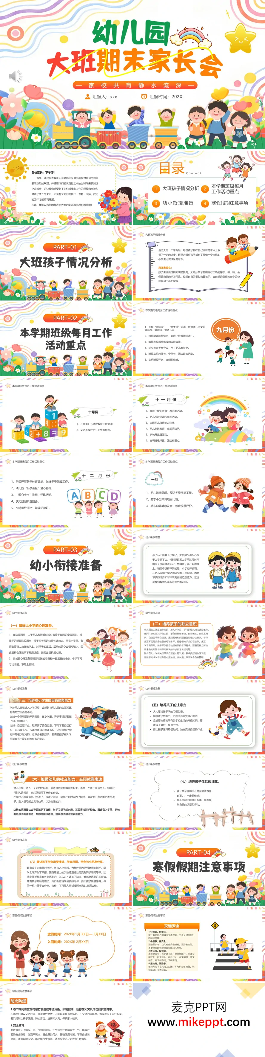 这套PPT以“家校共育 静水流深”为主题,围绕幼儿园大班期末家长会展开,内容结构清晰,共分为四个主要部分。 首先,PPT对大班幼儿的整体发展情况进行了分析,指出经过一学期的学习,孩子们在生活自理能力和任务意识方面均有显著进步,为进入小学做好了初步准备。其次,系统回顾了本学期各月的重点工作与活动安排,从九月的教师节活动到一月的冬季锻炼与期末评估,体现了教学活动的丰富性与连续性。 第三部分重点阐述了“幼小衔接”的各项准备工作,不仅关注知识过渡,更强调心理适应、自理能力、注意力、社交表达及规律生活习惯的培养,引导家长共同配合。最后,PPT详细列出了寒假期间的各项注意事项,包括交通安全、防火防爆、饮食健康、用电安全以及保持规律作息等,提醒家长确保孩子度过一个安全而有意义的假期。 整体来看,PPT内容全面,既有总结回顾,也有方法指导,体现了家园共育的理念与细致关怀。