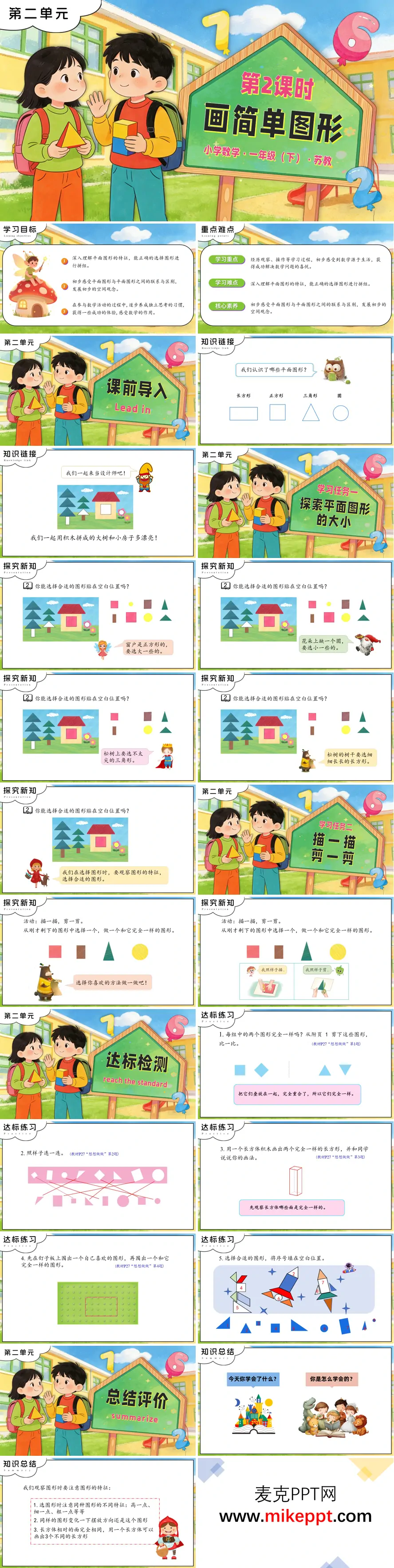 这是一套苏教版一年级下册数学第二单元第 2 课时 “画简单图形” 的课件,整体设计科学合理,结构完整,涵盖学习目标、重难点、课前导入、学习任务、达标练习与总结评价等模块,为一年级学生提供了一套系统的学习方案,帮助他们进一步掌握平面图形的特征,并通过动手操作培养空间观念。 课件首先明确学习目标,旨在让学生深入理解平面图形的特征,能够根据实际需求选择合适的图形进行拼搭,同时区分不同图形之间的联系与区别,进一步培养学生的空间观念。课件指出本节课的重难点是掌握图形的特征,并能够正确地进行拼画。这种目标和重难点的明确设定,为学生的学习提供了清晰的方向,使学生能够更有针对性地进行学习。 在课前导入环节,课件回顾了已学的平面图形,通过积木拼搭的情境引入新课。这种导入方式不仅帮助学生复习了旧知识,还激发了学生的学习兴趣,为新知识的学习做好了铺垫,使学生能够更顺利地进入新课的学习。 学习任务分为两个步骤。第一步是探索平面图形的大小。通过 “给大树小房子选图形” 的任务,引导学生明确选择图形时需要匹配图形的特征与大小。例如,窗户适合选择正方形,花朵适合选择圆形。通过这种实际情境的任务,学生能够更好地理解图形的特征,并学会根据实际需求选择合适的图形。第二步是 “描一描剪一剪”。通过操作活动,学生制作与样本一致的图形,掌握描图、折剪等方法。这种动手操作不仅帮助学生巩固了图形的特征,还培养了学生的动手能力和空间想象能力。 在达标练习部分,课件设计了多种题型,包括判断图形是否一致、连线匹配、用长方体画相同长方形、钉板围图形、选图拼图案等。这些练习题不仅涵盖了对图形特征的巩固,还通过动手操作帮助学生进一步加深对平面图形的认识。通过这些练习,学生能够在实践中巩固所学知识,提升对图形的辨识能力和空间想象能力。 最后,在总结评价部分,课件对图形的观察要点进行了梳理,帮助学生系统地回顾和整理本节课所学的知识要点。同时,课件还设置了自评与互评环节,鼓励学生对自己的学习情况进行自我评价,并与同伴进行交流和评价。这种评价方式不仅帮助学生反思自己的学习过程,还培养了学生的合作意识和自我评价能力。 整体而言,这套课件通过明确的学习目标、有趣的课前导入、分步骤的学习任务设计、丰富的达标练习以及系统的总结评价,结合直观的操作活动,帮助一年级学生在轻松愉快的学习氛围中进一步掌握平面图形的特征。这种教学设计不仅符合一年级学生的认知特点,还有效提升了学生的学习兴趣和空间观念,是一份高质量的教学课件。