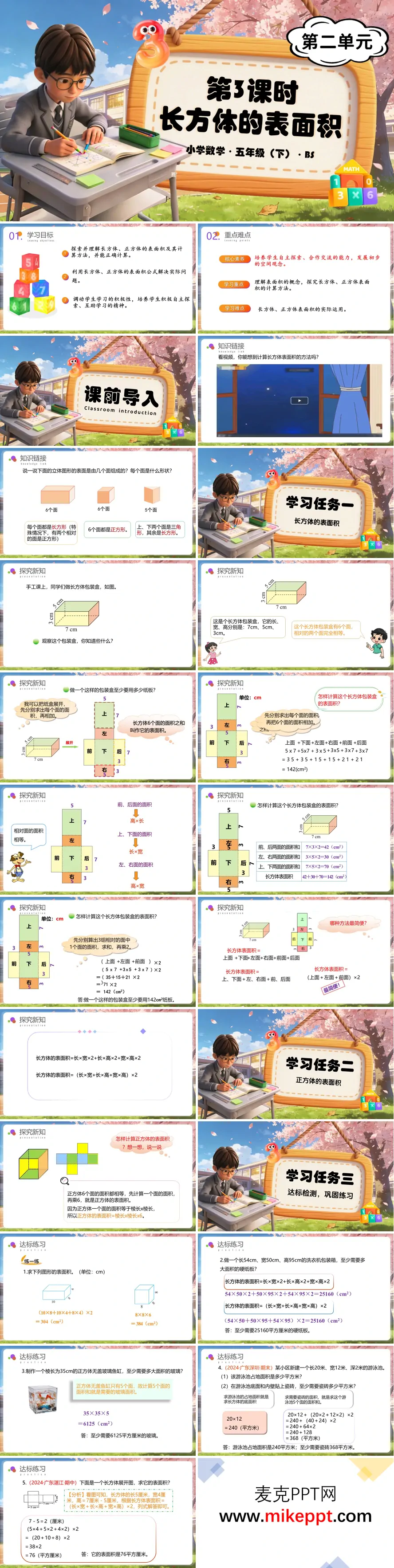 这份“长方体的表面积”课件以“概念—公式—应用—优化”为主线,借助视频、展开图和分层练习,引导学生从“数面”到“算面”再到“用面”,系统掌握长方体和正方体表面积的计算方法。开篇播放“快递装箱”短片:机械臂自动裁剪纸板折叠成盒,提问“这张纸板到底多大?”瞬间激活学生探究欲望。 任务一“长方体表面积”用动态展开图演示:沿棱剪开后六个面平铺成十字形,长、宽、高分别用红、蓝、绿三色标注,学生直观看到“上下、前后、左右”三对相对面相等,教师顺势板书三种算法:①逐面相加;②三对面积和;③(长×宽+长×高+宽×高)×2,对比后提炼最简公式,并用“长宽、长高、宽高各一对”口诀帮助记忆。 任务二“正方体表面积”则利用“相对面全等”特性:展开图六个正方形边长相同,直接得出“棱长×棱长×6”,动画展示“棱长平方×6”的推导过程,强化“正方体是长方体特例”的认识。 任务三“达标检测”设计“生活四情境”:①基础计算——给定长、宽、高求表面积;②包装箱——计算所需纸板面积并加1%损耗;③无盖鱼缸——只求5个面,强调“少一个上盖”;④游泳池贴瓷砖——侧壁+底面,渗透“五面体”变式,系统实时统计正确率,教师针对“漏算面”“单位不统一”再演示,确保应用到位。 总结用“一张思维导图”收束:展开图→相对面相等→长方体公式→正方体特例→生活应用,学生用便利贴写下最易错点贴于展板,形成班级“表面积警示墙”;自我评价从“我会算、我会选面、我肯检查”三面点赞,小组互评贴星星,让知识、情感双提升。 整份课件用“视频激趣—展开演示—公式提炼—生活应用”四连击,把表面积从“六个面”升级成“会裁剪、会选面、会优化”的实用技能,既夯实计算方法,又培养空间观念与优化意识,为后续体积、综合实践奠定坚实而有趣的基础。