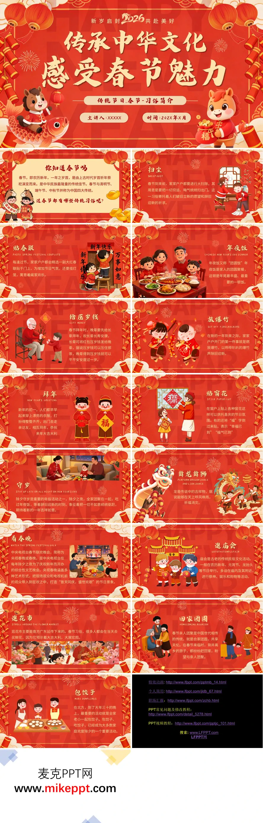 这套PPT以“传承中华文化,感受春节魅力”为主题,图文并茂地介绍了中国最重要的传统节日——春节的丰富习俗。整体内容从春节的起源切入,将其定义为“一年之岁首”,并点明其与清明、端午、中秋并列为中国四大传统节日的地位。 PPT的核心部分系统性地展示了多项核心年俗活动。首先介绍了年前的准备,如“扫尘”寓意辞旧迎新,“贴春联”和“贴窗花”以营造喜庆氛围。接着重点描绘了除夕当天的重头戏:全家团聚共进象征圆满的“年夜饭”,以及“包饺子”、“守岁”迎接新年。对于新年期间的活动,PPT涵盖了“拜年”祝福、长辈给晚辈“压岁钱”以祈福压祟、“放爆竹”除旧岁,以及“舞龙舞狮”等娱乐庆祝。此外,还介绍了具有地域特色的“逛花市”和融合传统与现代的“看春晚”、“逛庙会”等活动。最后,“回家团圆”这一页则深刻点明了春节作为文化核心的亲情团聚内涵。 整套PPT通过简洁的文字和生动的配图,将春节从准备到庆祝的各项习俗串联起来,不仅清晰地呈现了习俗的具体形式,更阐释了其背后蕴含的祈福消灾、阖家团圆、辞旧迎新的美好愿望,有效地传递了春节深厚的文化魅力。