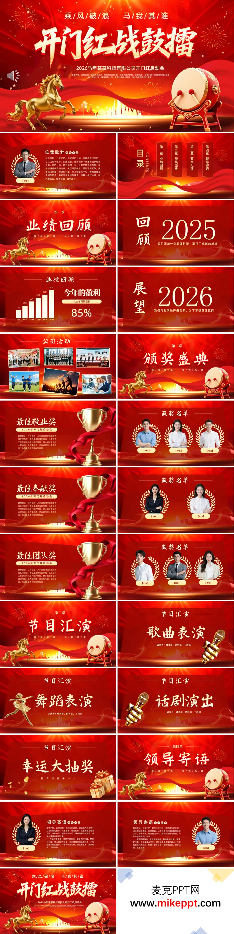 这套PPT以“乘风破浪 马我其谁”为主题,生动呈现了某某科技有限公司2026马年开门红启动会的整体框架与核心内容。PPT结构清晰,共分为四个章节,贯穿了业绩回顾、颁奖盛典、节目汇演和领导寄语,全面展现了公司在新年伊始的战略规划与文化氛围。 第一章“业绩回顾”突出公司在2025年团结拼搏取得的卓越成绩,重点强调盈利比去年同期增长85%的亮眼数据,并附有相关图表呈现增长趋势 ,体现团队与时俱进、开拓创新的精神。第二章“颁奖盛典”设置最佳敬业奖、最佳奉献奖和最佳团队奖三大奖项,通过获奖名单和人物形象展示 ,突出员工勤恳敬业、甘于奉献的团队精神。第三章“节目汇演”呈现多元文化活动,包括歌曲、舞蹈、话剧等跨部门合作表演,并设置幸运抽奖环节增强互动性。第四章“领导寄语”以“马年大吉”为主题,鼓励员工卸下包袱轻装上阵,强调健康平安的重要性,传递出公司对员工关怀与未来发展的积极展望。 整体来看,PPT内容层次分明,图文结合紧密,既体现了企业务实进取的文化基调,又通过奖项设置和文娱环节增强了团队凝聚力,展现出公司在新一年乘风破浪、勇往直前的信心与决心。