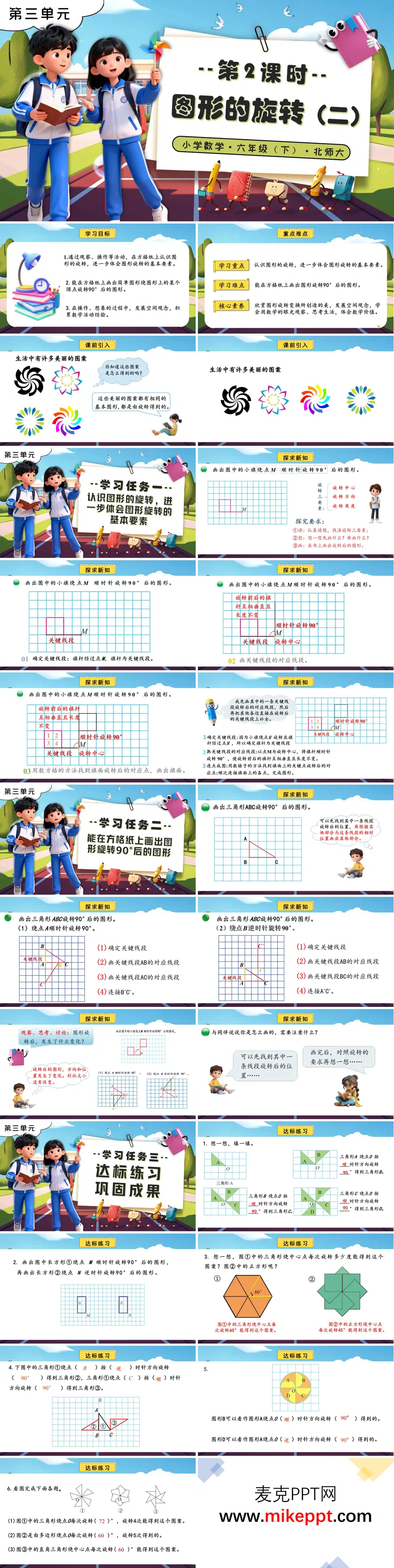 本节课是北师大版六年级下册第三单元第 2 课时 “图形的旋转(二)”,主要目标是让学生认识图形旋转的基本要素,掌握在方格纸上画出图形旋转 90° 后的图形的方法,并通过学习过程发展空间观念。 PPT以生活中常见的旋转图案为切入点,引导学生观察并发现这些图案是由基本图形通过旋转得到的,从而引出本节课的学习主题。在学习任务一中,通过“画小旗绕 M 点顺时针旋转 90°”的任务,详细分解了操作步骤:先确定关键线段,再画出对应的线段,接着通过数方格找到关键点,最后连接这些点形成旋转后的图形。这一过程帮助学生明确了图形旋转的三个核心要素——旋转中心、旋转方向和旋转角度。 学习任务二进一步拓展,引导学生进行三角形绕不同顶点(A、B)旋转 90° 的画图练习。通过重复关键线段法的操作,学生不仅巩固了旋转的基本方法,还深刻体会到旋转后图形的形状和大小保持不变这一重要性质。 在后续的达标练习环节,设计了包括旋转要素填空、图形旋转画图、旋转角度判断等多种题型,帮助学生在不同情境中强化对旋转要素和画图方法的理解与应用。这些练习旨在通过多样化的形式,帮助学生巩固所学知识,提升空间思维能力。 最后,通过知识总结,梳理了在方格纸上画旋转图形的四步法,使学生对本节课的重点内容有更清晰的梳理和回顾。搭配课后画图实践作业,进一步巩固学生对图形旋转的理解和操作技能,帮助他们在实践中提升空间观念和动手能力。