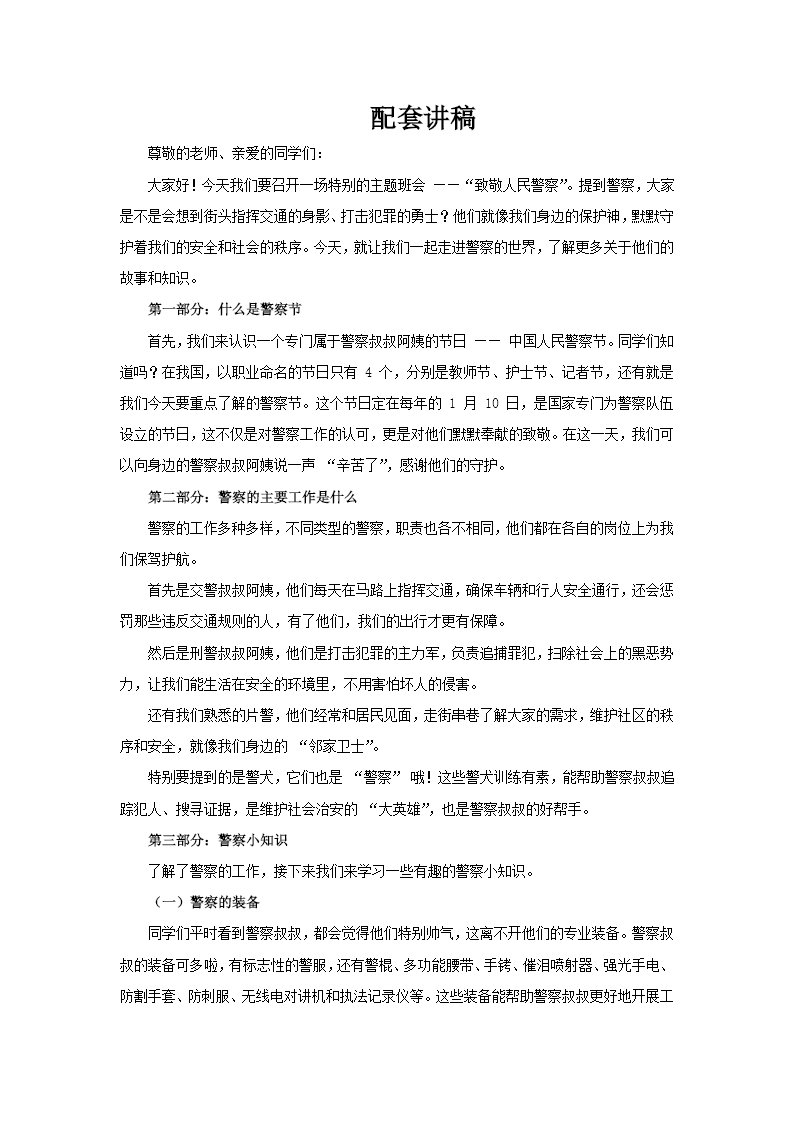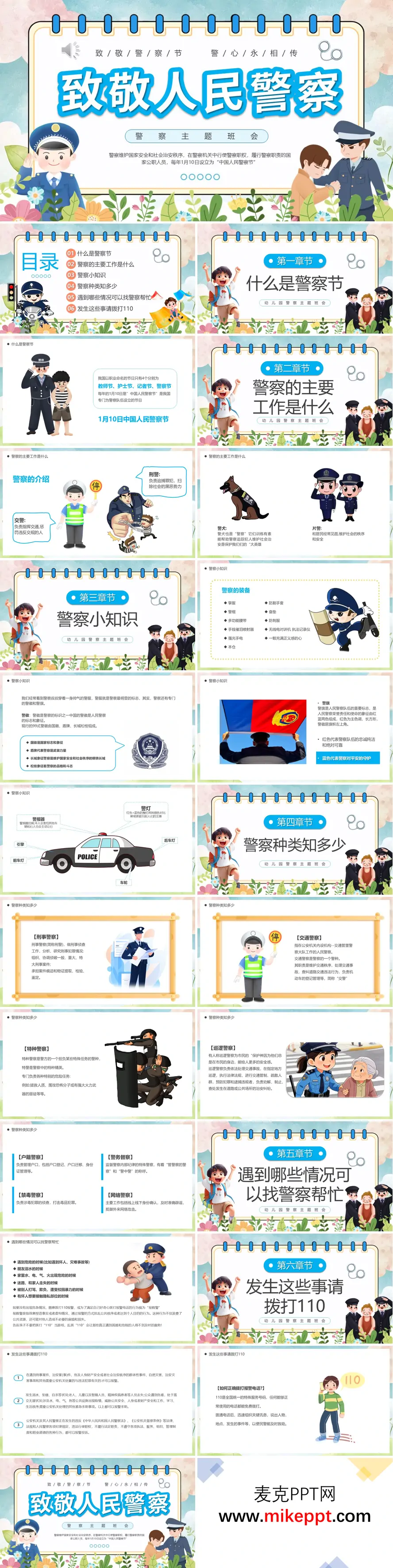 这套PPT以“认识人民警察”为主题,通过六个章节系统性地向公众(尤其是青少年)介绍了警察的相关知识。内容首先从“中国人民警察节”的设立切入,明确了警察职业的崇高性。接着,PPT详细列举了刑警、交警、片警等不同警种的主要职责,并特别提到警犬作为特殊“警员”的重要贡献。在“警察小知识”部分,图文并茂地展示了警服、警徽、警旗的象征意义以及各种单警装备,生动体现了警察队伍的规范化和专业性。 PPT的后半部分具有极强的实用性和教育意义,重点阐述了在何种紧急或困难情况下可以向警察求助,并详细指导公众如何正确拨打110报警电话。同时,它也明确指出了“报假警”行为的危害性,旨在培养公民的责任意识,引导社会公众合理使用宝贵的警务资源。整体而言,这套PPT结构清晰,内容兼具知识性、趣味性和教育性,是一份出色的警民关系与公共安全科普材料。