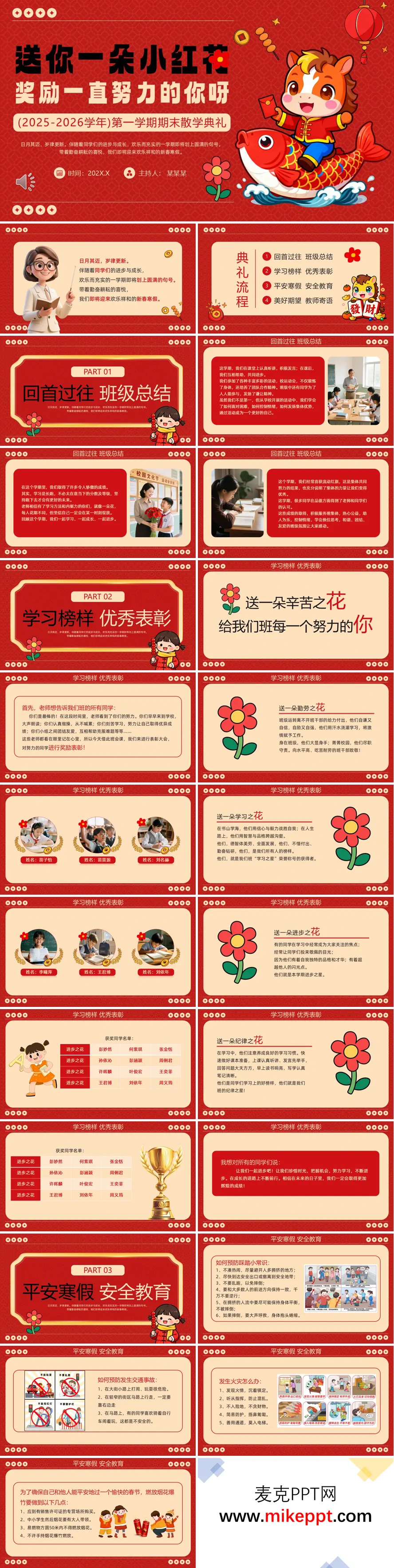 这是一份2025-2026学年第一学期期末散学典礼的PPT课件,主题为"送你一朵小红花,奖励一直努力的你"。整体分为四个部分: 第一部分"回首过往·班级总结"回顾了学期内的课堂表现、运动会、文化节等活动,强调集体力量和品德成长;第二部分"优秀表彰·学习榜样"是核心内容,以"送花"形式奖励各类优秀学生:班干部获"勤劳之花",王君博等同学获"学习之花",何紫琪等十多位同学获"进步之花"和"纪律之花";第三部分"平安寒假·安全教育"系统讲解防踩踏、交通安全、火灾应对及烟花爆竹安全知识;第四部分"美好期望·教师寄语"以温暖励志的话语鼓励学生保持热爱,奔赴下一场山海。全篇采用小红花、emoji等元素,营造温馨励志的氛围。
