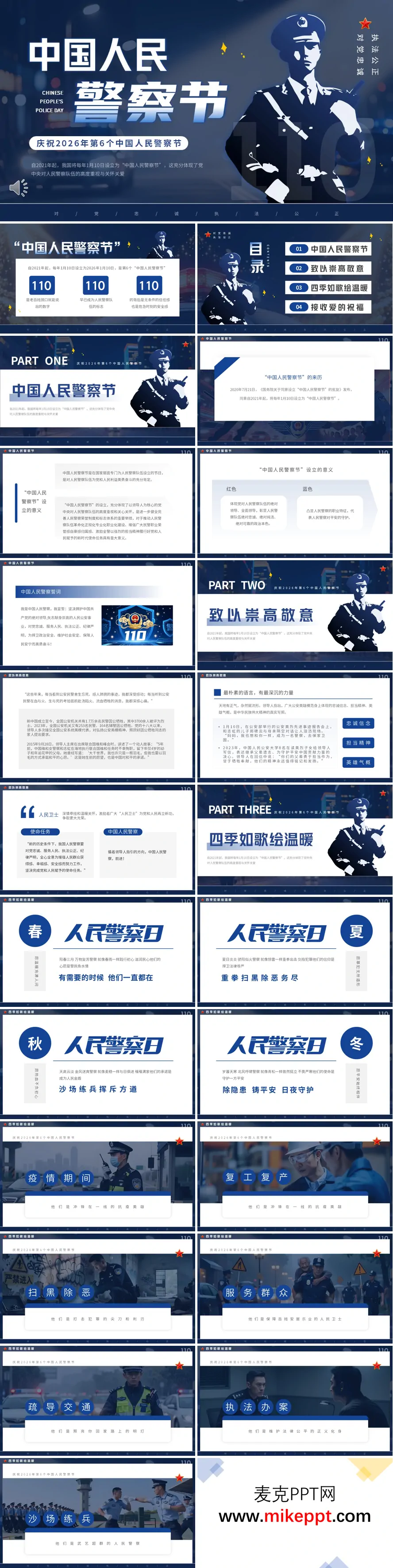 这套PPT以“庆祝2026年第6个中国人民警察节”为主题,整体设计庄重而富有情感,分为四个主要部分。 第一部分回顾了“中国人民警察节”的设立背景和意义,强调了自2021年起每年1月10日被设立为警察节的重要性,体现了党中央对警察队伍的关怀。内容包含警察节的由来、象征色彩(红色代表忠诚,蓝色象征职业守护)以及人民警察誓词,突出“对党忠诚、执法公正”的核心精神。 第二部分表达对人民警察的崇高敬意,通过真实数据和感人故事展现警察队伍的牺牲与奉献,如因公牺牲的民警人数、领导人对其家属的关怀,以及英烈子女继承父辈遗志的决心,彰显忠诚信念与担当精神。 第三部分以“四季如歌绘温暖”为主题,通过春、夏、秋、冬四个季节的比喻,描绘警察在不同场景下的使命——如春季滋润民心、夏季打击犯罪、秋季练兵守护、冬季坚守平安,并配以抗疫、护航等现实画面,体现警察全年无休的守护。 第四部分呈现来自群众、家人的暖心祝福,以活泼的标签和真挚的语言展现警察在他人眼中的形象,并传递“平安出警”“节日快乐”等美好祝愿,强化警民情感纽带。 整套PPT结构清晰,图文结合紧密,既体现了警察队伍的政治属性和职业荣誉,也充满人文关怀,生动诠释了人民警察的使命与担当。