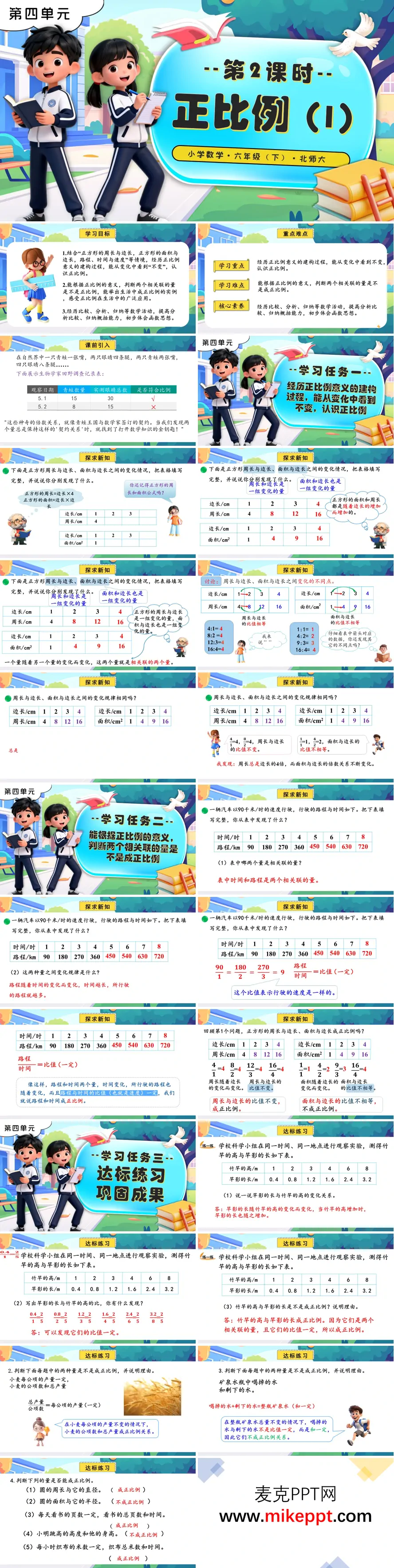 这是一套北师大版六年级下册数学第四单元第 2 课时“正比例(1)”的教学课件,旨在帮助学生构建正比例的意义并掌握判断正比例的方法,贴合六年级学生数学认知的进阶需求。 课件的学习目标是让学生通过正方形周长与边长、路程与时间等具体情境,经历正比例意义的形成过程,从而认识正比例关系。学生将能够判断两个相关联的量是否成正比例,并感受正比例在生活中的广泛应用,提升自身的分析能力。本课的重难点在于引导学生从“变化中找不变”,理解正比例的内涵,并掌握成正比例的判断方法。 课件以“青蛙儿歌”作为课前引入,激发学生的学习兴趣,自然过渡到核心学习任务。核心任务分为三个部分:第一部分通过正方形周长与边长、面积与边长的表格对比,让学生观察两者的变化关系。其中,周长与边长的比值始终保持为 4,而面积与边长的比值则随边长的变化而变化。通过这种对比,学生初步感知“相关联的量”以及“变化中的不变”这一关键概念。第二部分借助汽车匀速行驶的路程 - 时间表格,进一步明确“相关联的量、一个量随另一个量变化、比值一定”是成正比例关系的核心条件,帮助学生深入理解正比例的本质特征。第三部分是达标练习,通过竹竿高度与影长、小麦产量等实际案例,巩固学生对正比例判断方法的掌握,强化知识应用能力。 在课程结尾,课件总结了正比例的定义与表达式,帮助学生梳理本节课的重点知识。课后作业则要求学生寻找生活中的正比例量,鼓励他们将所学知识与实际生活相结合,进一步拓展对正比例关系的理解和应用。 整体而言,这套课件设计巧妙,通过丰富的实例和直观的表格,引导学生逐步理解正比例的意义和判断方法。从生活化的引入到逐步深入的探究,再到巩固练习和课后拓展,课件充分体现了以学生为中心的教学理念,有助于学生在探究中掌握知识,提升数学思维能力。