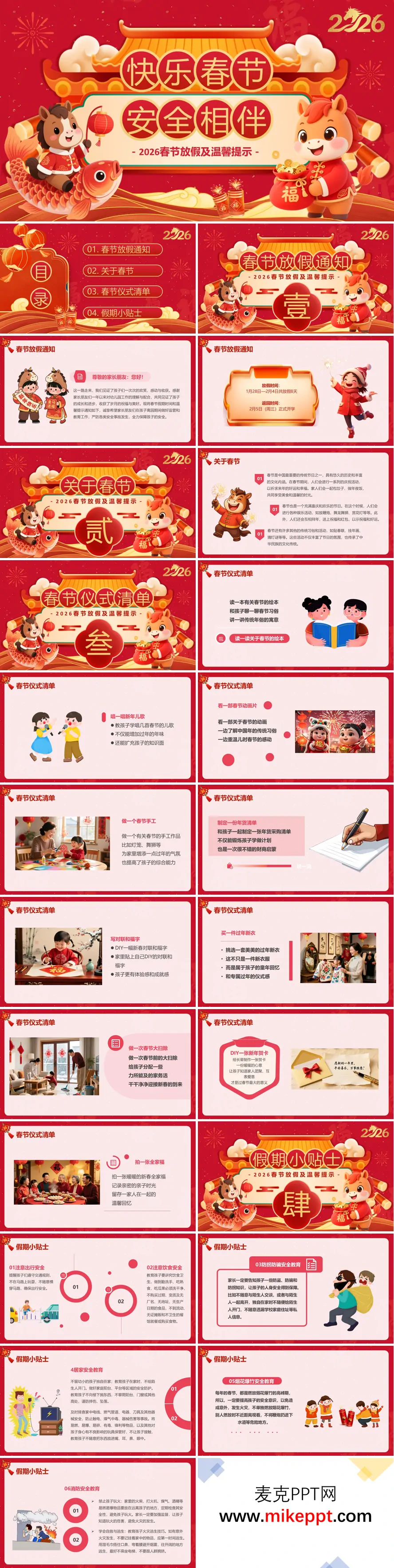 这是一套面向幼儿园家长的《2026春节放假及温馨提示》PPT,以"快乐春节 安全相伴"为主题。内容分为四部分:放假通知明确1月28日至2月4日放假8天,2月5日返园;春节介绍简述节日文化内涵与传统习俗;核心亮点是"春节仪式清单",为家长提供10项亲子活动建议,包括读绘本、唱儿歌、看动画、做手工、备年货、写福字、购新衣、大扫除、制贺卡、拍全家福等,强调仪式感与传统文化体验;假期小贴士则涵盖出行、饮食、防拐骗、居家、烟花爆竹、消防六大安全主题,细致提醒家长做好监管。整体风格温馨实用,既注重传统文化启蒙,又突出安全教育,是一份兼具人文关怀与实用价值的假期家园共育指南。