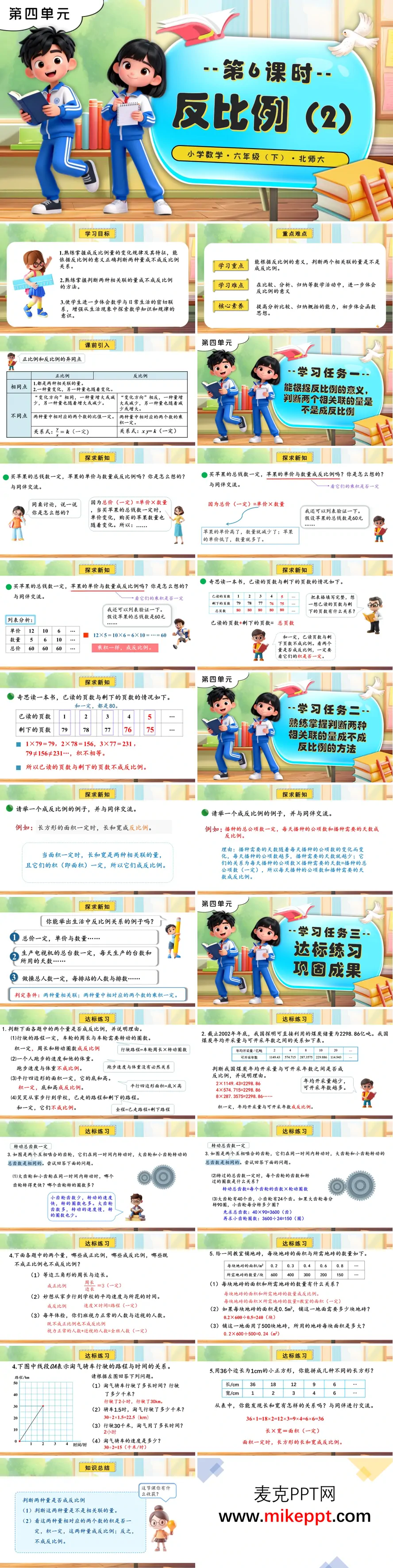 这是一套北师大版六年级下册数学第四单元第 6 课时“反比例(2)”的教学课件,专注于帮助学生进一步理解和应用反比例关系,巩固反比例的核心概念。课件通过丰富的实例和对比分析,引导学生掌握反比例的判断方法,并体会数学与生活的紧密联系。 课件的学习目标是让学生掌握反比例的变化规律,能够依据反比例的意义判断两个相关联的量是否成反比例,并熟练运用判断方法。同时,通过生活中的实际应用,帮助学生体会数学与生活的关联。本课的重难点在于精准判定两个量是否满足“相关联且积一定”的反比例条件。 在课前引入环节,课件通过“正比例与反比例异同点对比表”,帮助学生厘清正比例(比值一定)与反比例(积一定)的区别,为后续学习奠定基础。核心学习任务分为三个部分:第一部分通过“买苹果总钱数一定,单价与数量”的案例,引导学生用表格验证“积一定”来判定成反比例关系;同时,以“已读页数与剩下页数”为例,说明“和一定”并不满足反比例条件,帮助学生避免常见的判断误区。第二部分通过长方形面积一定时长宽的关系、播种总公顷数一定时每天播种数与天数的关系等实例,进一步强化学生对反比例关系的判断方法,帮助学生熟练掌握判断逻辑。第三部分是达标练习,涵盖行程、煤炭开采、齿轮转动、铺地砖等多种实际应用场景,不仅巩固了判断逻辑,还融入了长方形拼组的应用,拓展学生的思维能力。 在课程结尾,课件总结了反比例的判断步骤,帮助学生梳理本节课的重点知识。课后作业包含分层练习,满足不同层次学生的学习需求,同时引导学生了解反比例图象,为后续学习做好铺垫。 整体而言,这套课件设计科学合理,通过对比分析、实例验证和分层练习等多种方式,帮助学生从理论到实践逐步掌握反比例关系的判断方法。从课前引入到核心任务的层层递进,再到巩固练习和课后拓展,课件充分体现了以学生为中心的教学理念,有助于学生在探究中掌握知识,提升数学思维和应用能力。